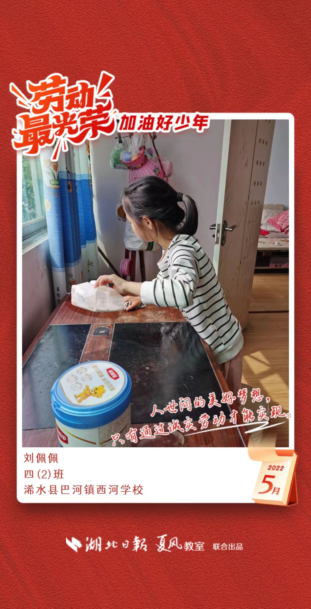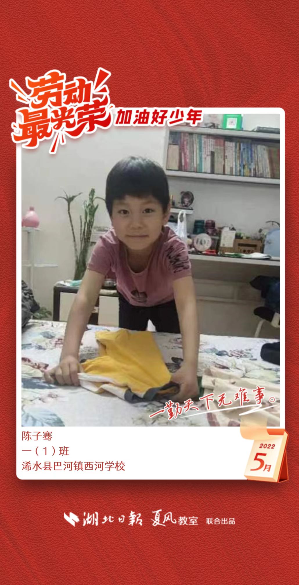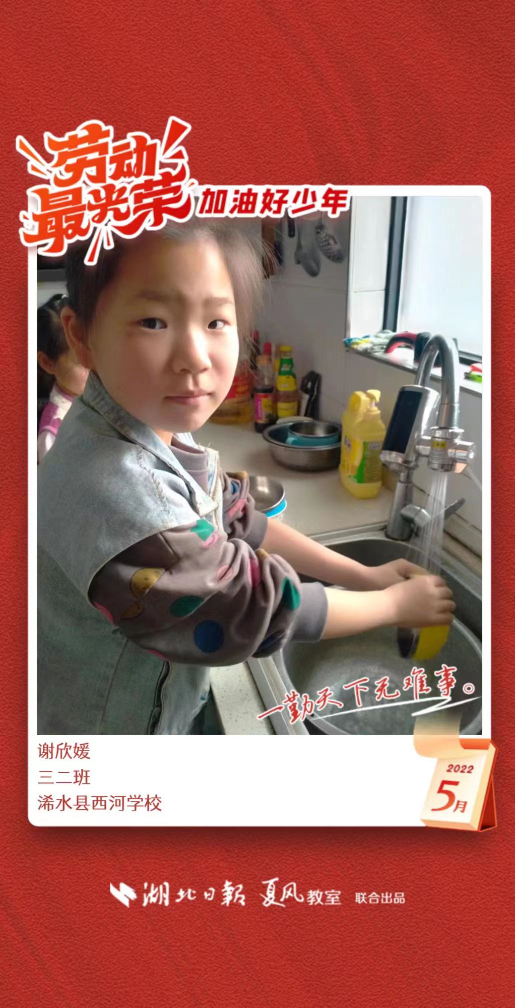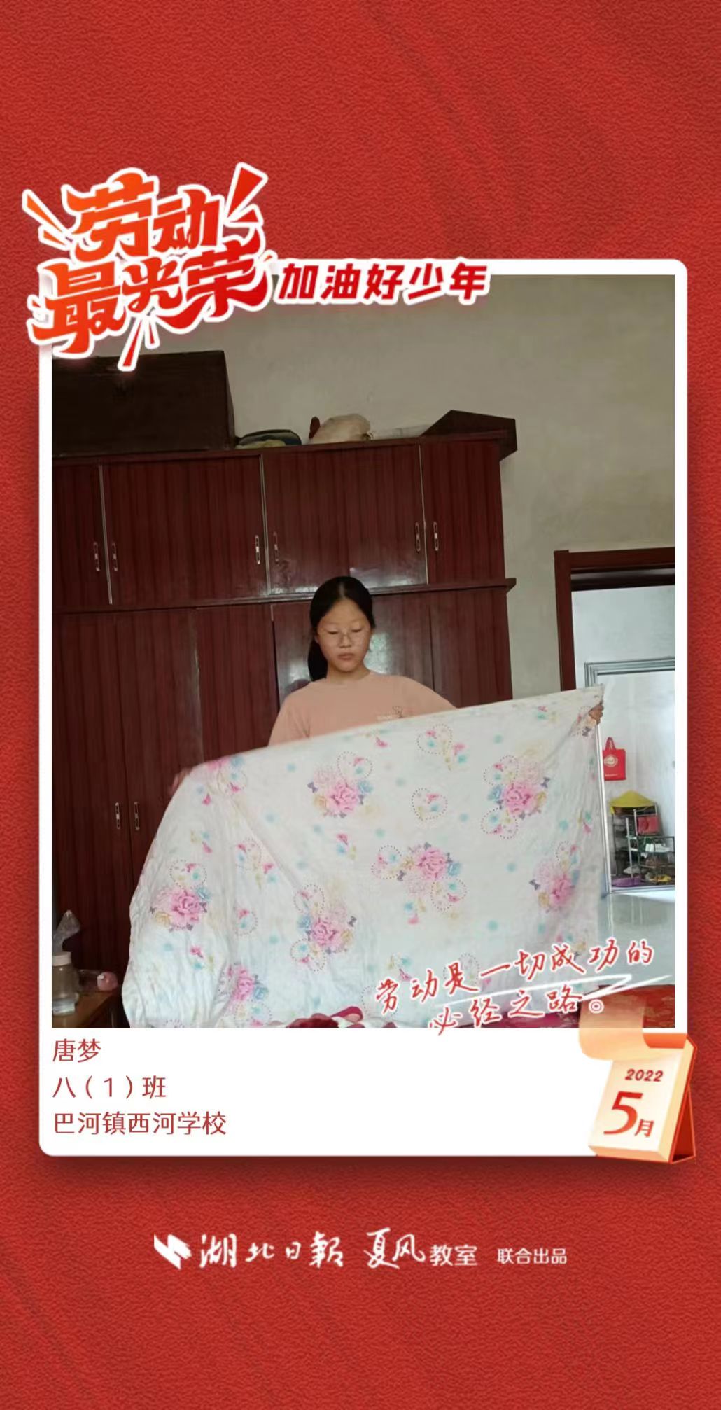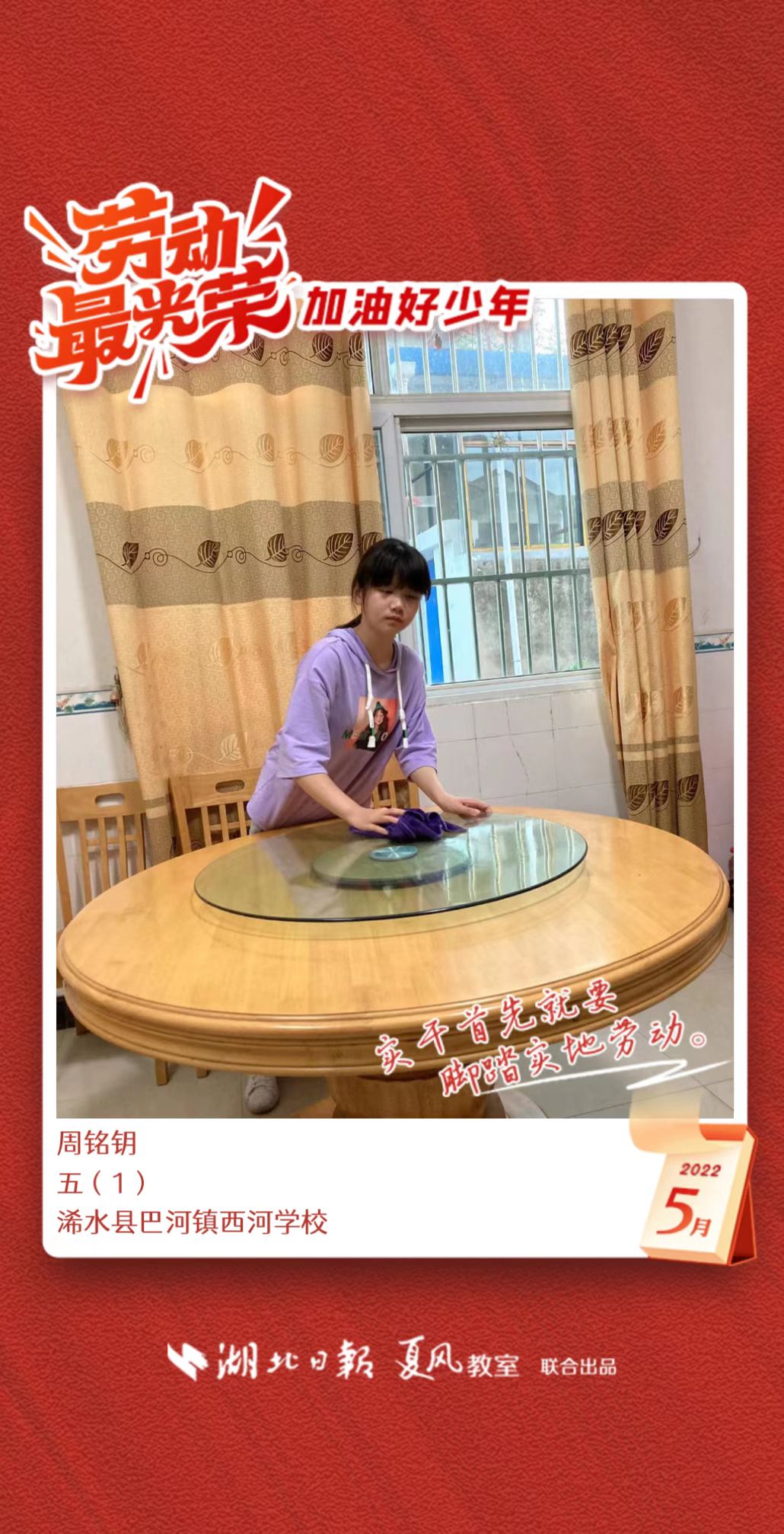 3、填写学生信息,自愿上传学生劳动照片即可,一键生成有“湖北日报”落款的个人专属海报,长按图片下载保存。