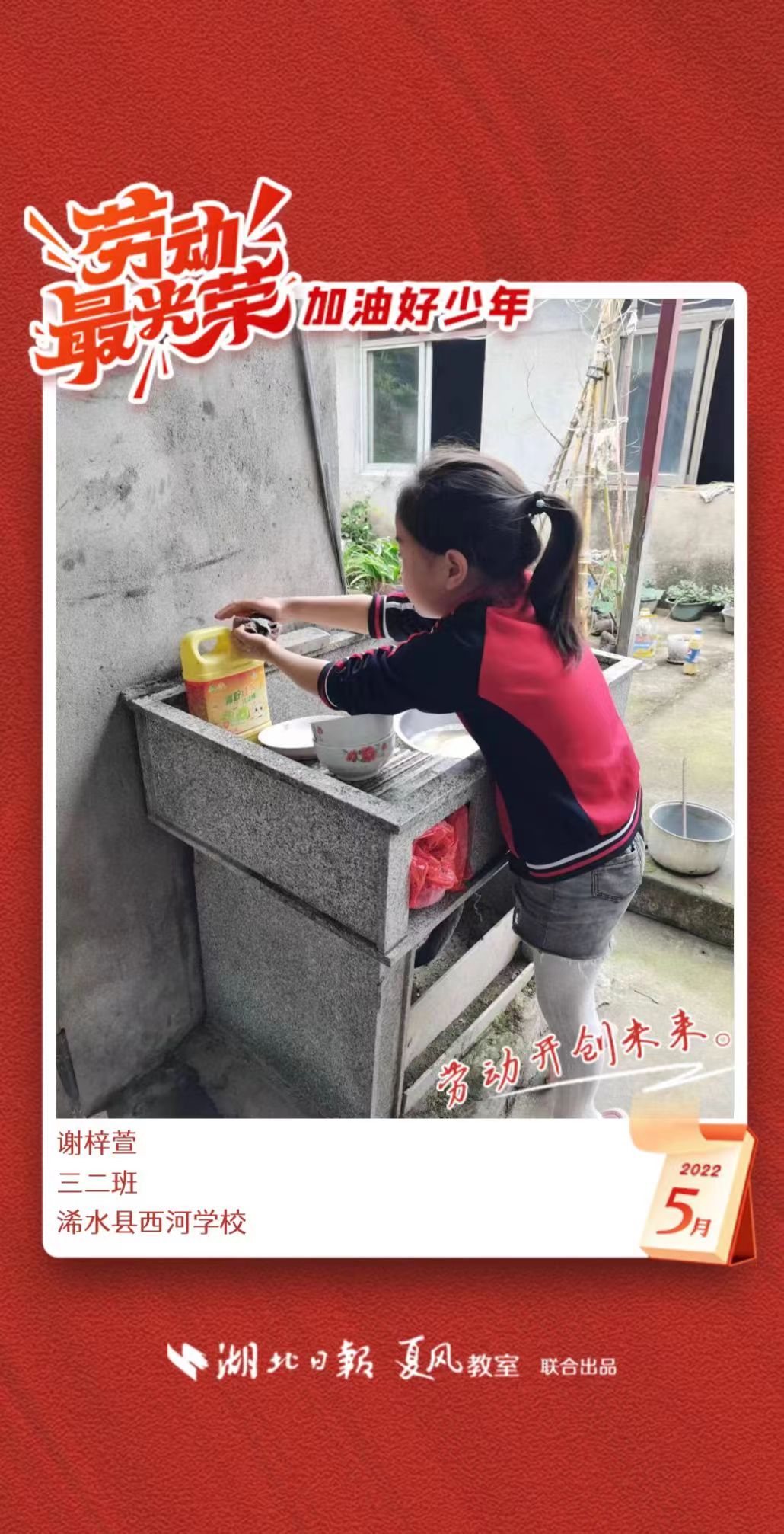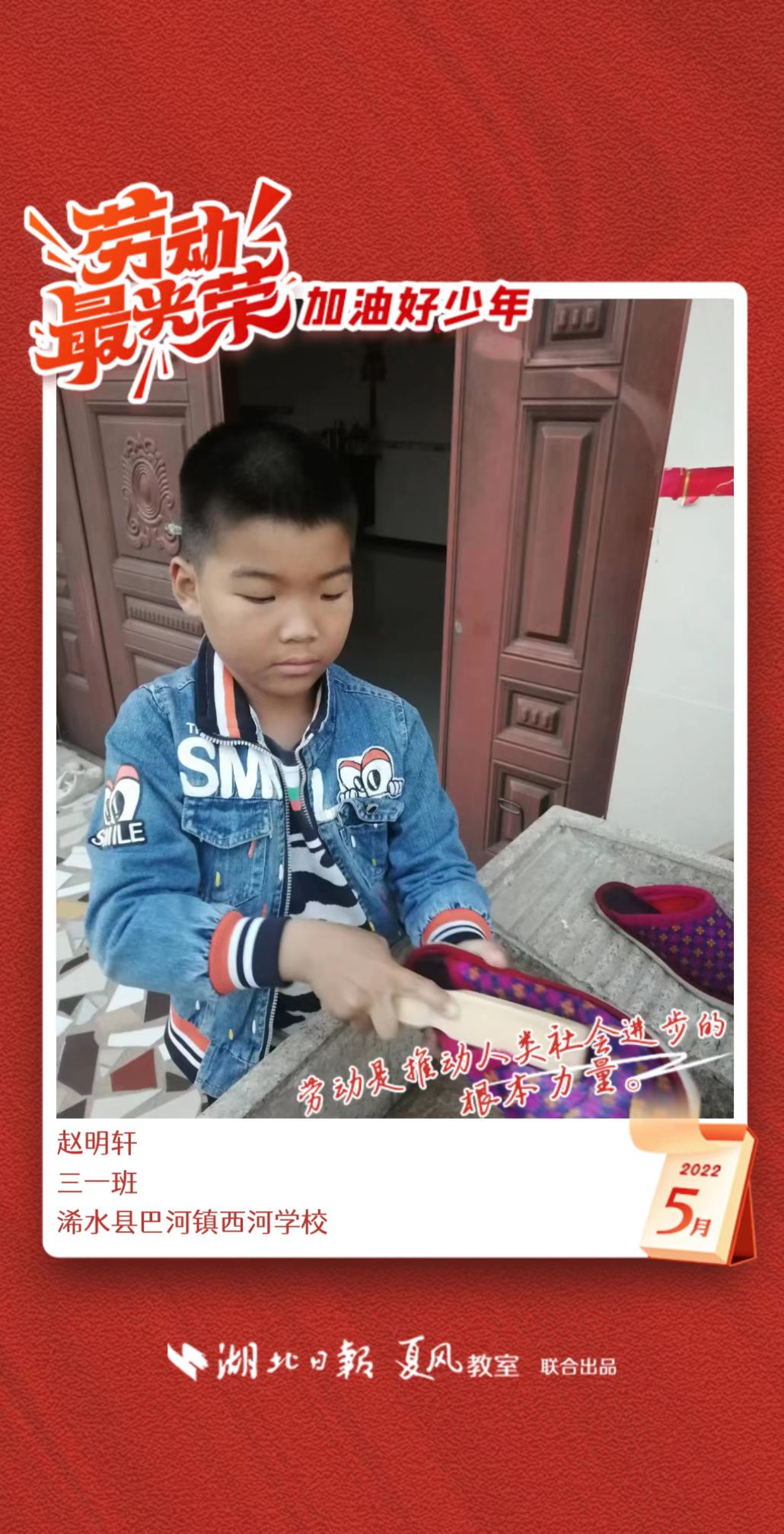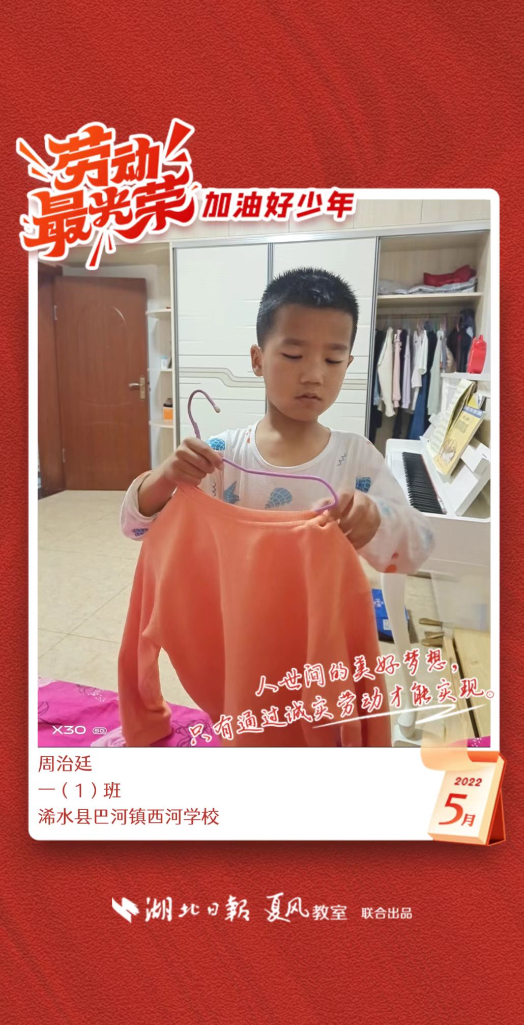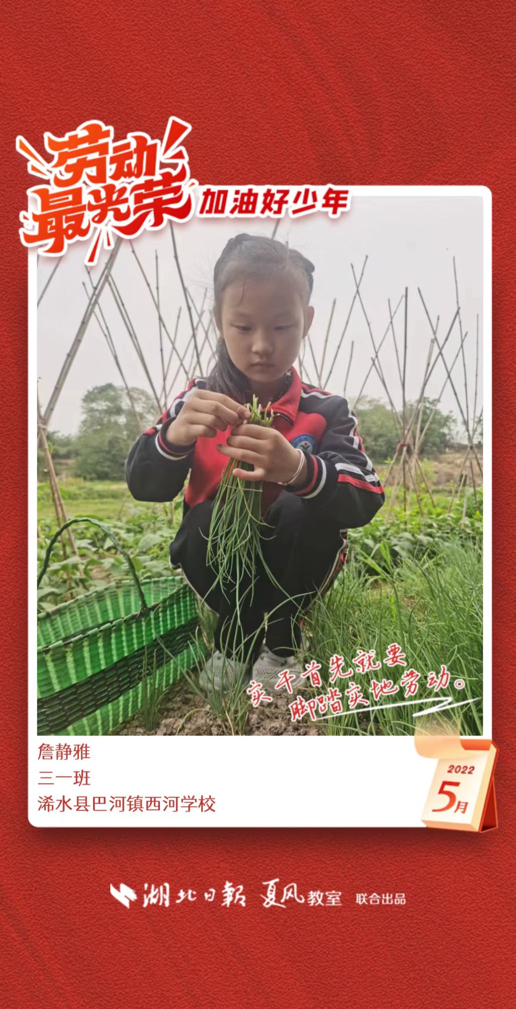 3、填写学生信息,自愿上传学生劳动照片即可,一键生成有“湖北日报”落款的个人专属海报,长按图片下载保存。