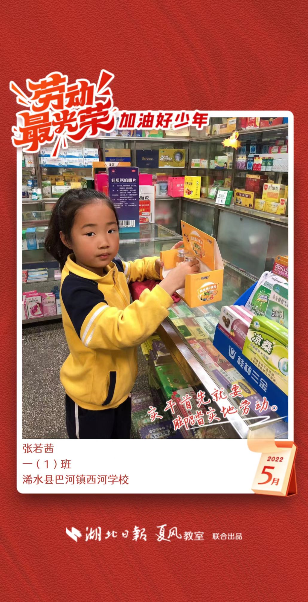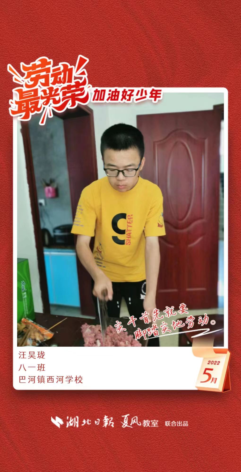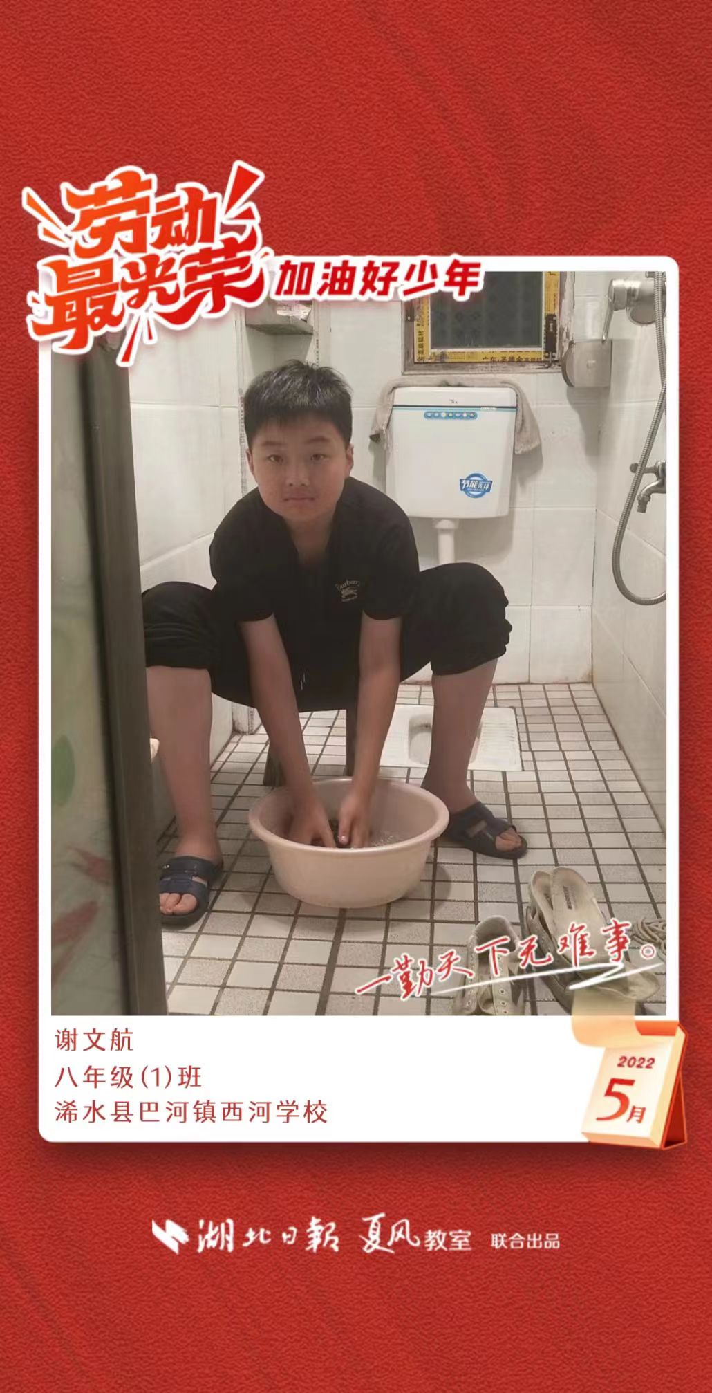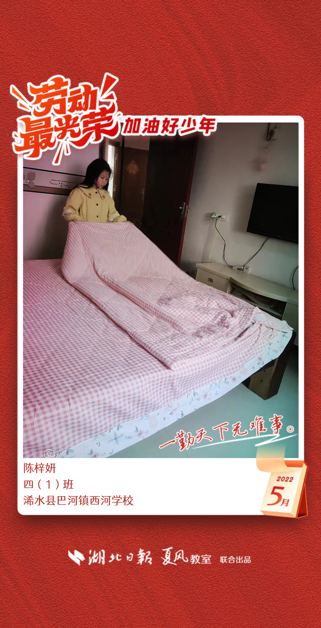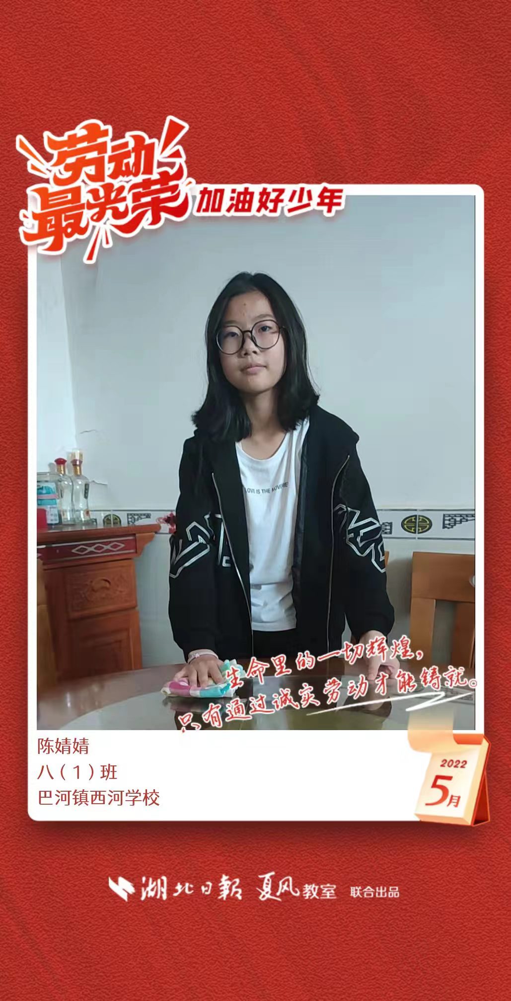 3、填写学生信息,自愿上传学生劳动照片即可,一键生成有“湖北日报”落款的个人专属海报,长按图片下载保存。