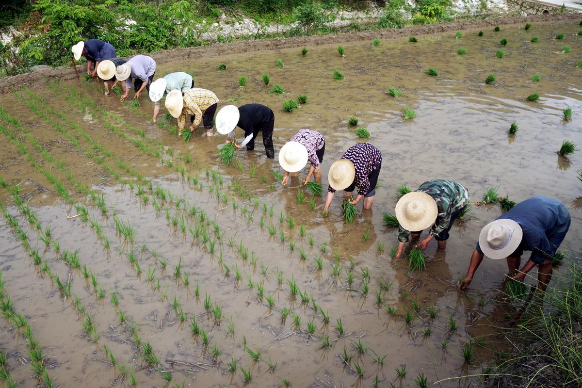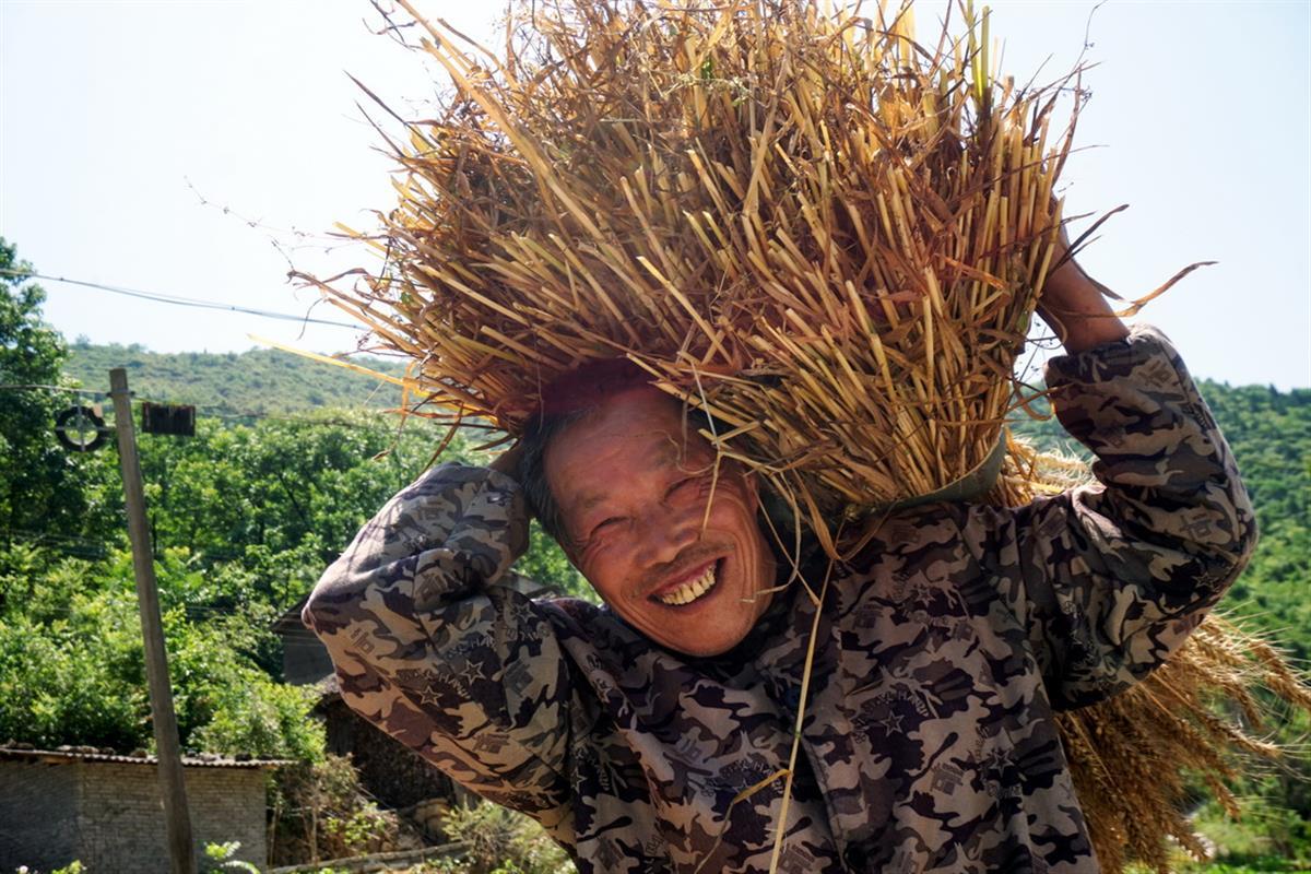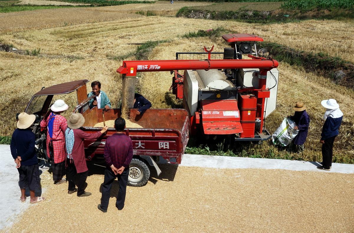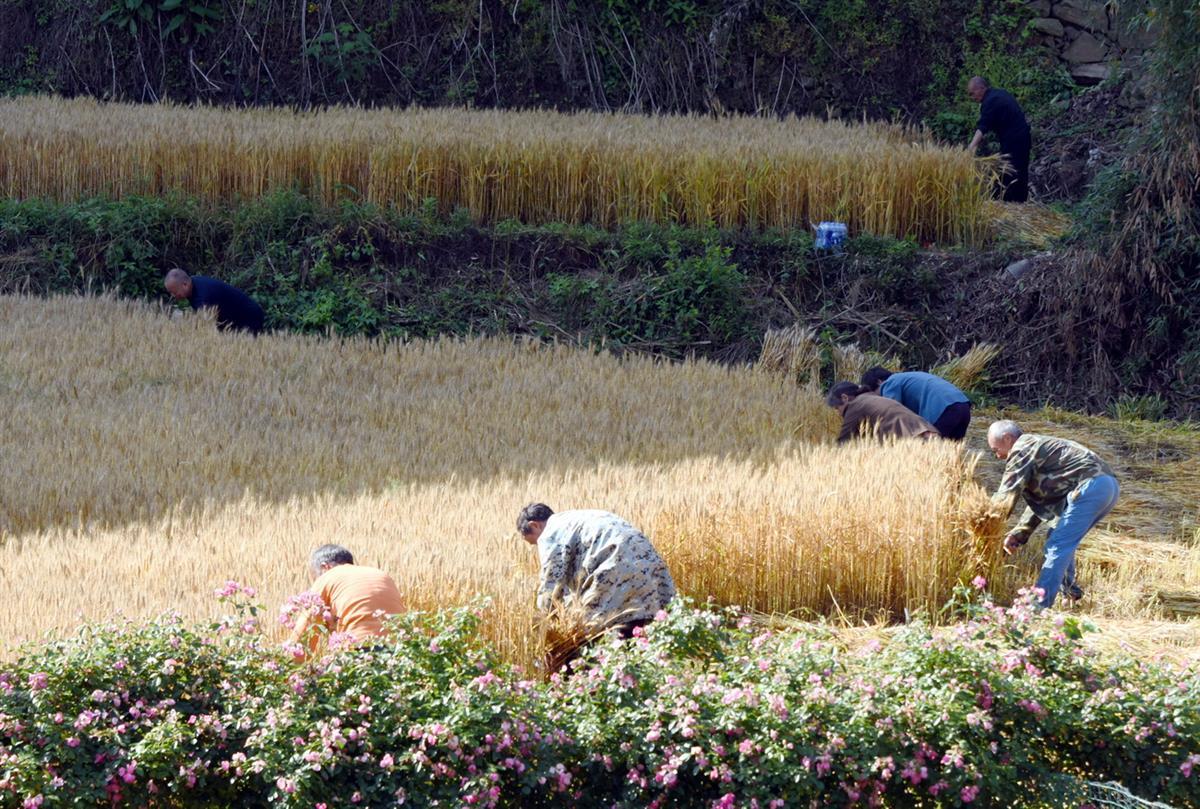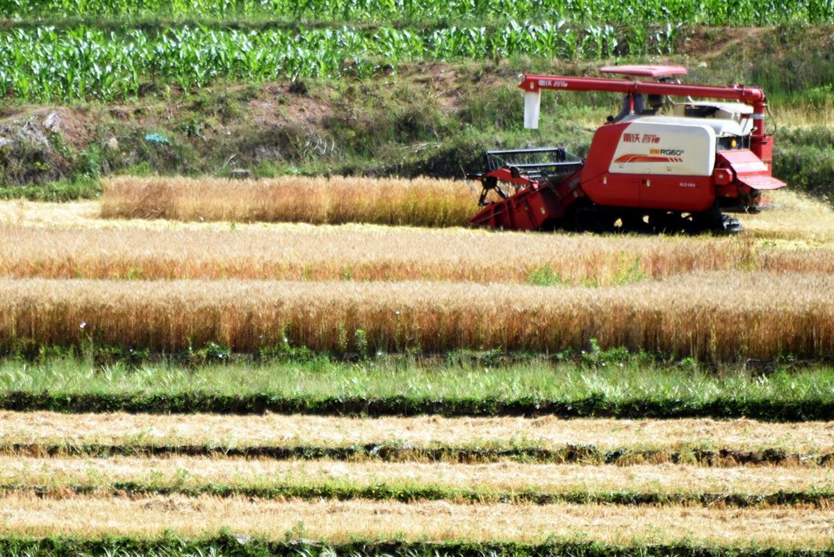 十堰市郧阳区32万亩小麦进入抢收抢种时节,亩产达650斤左右,总产量达7.8万吨。互助水稻插秧紧跟其后。图为5月29日,麦收和插秧时的情景。(湖北日报通讯员 周家山 摄)