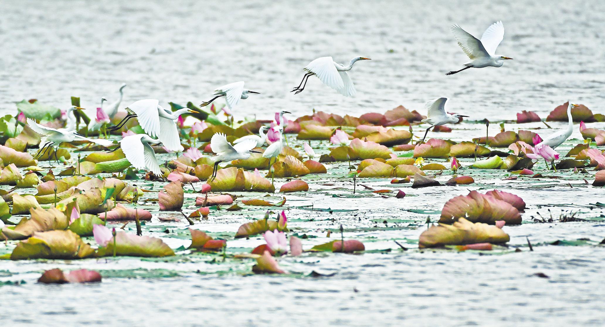 枝江金湖国家湿地公园内百鸟翔集。短短几年,枝江深入推进化工企业“关改搬转治绿”,境内109公里长江岸线生态环境得到长效改善。 (湖北日报全媒记者 刘曙松 摄)