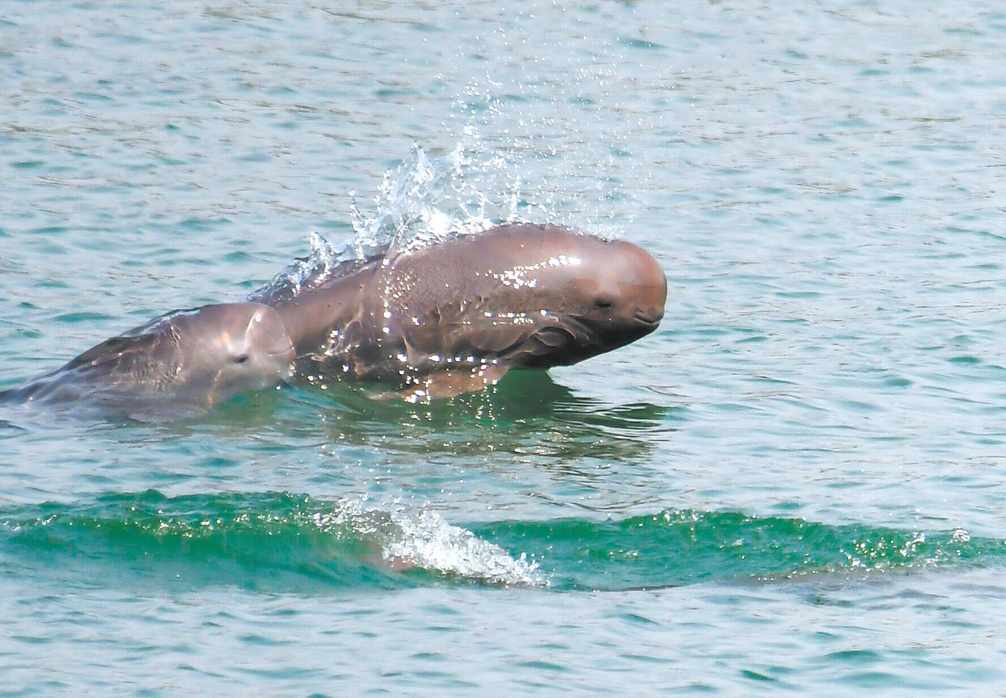 一只江豚妈妈带着小江豚在江中嬉戏。 (湖北日报全媒记者 刘曙松 摄)