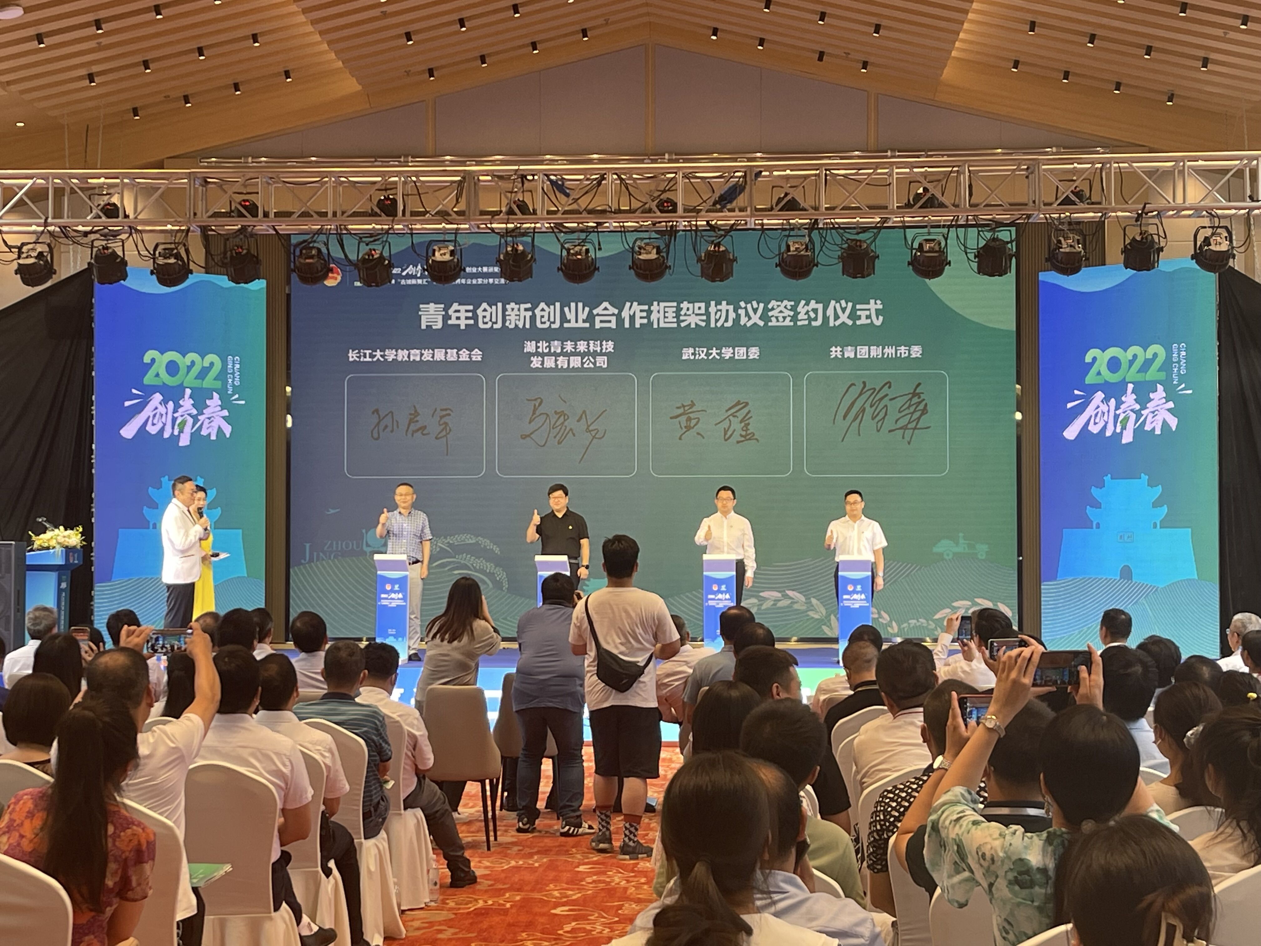 在24日举行的2022年“创青春”湖北青年创新创业大赛颁奖仪式暨“古城新智汇”宜荆荆恩青年企业家分享交流会上,共青团荆州市委与武汉大学团委、湖北青未来科技发展有限公司、长江大学教育发展基金会签订了青年创新创业合作框架协议,宣布“荆州学子联盟”成立,为6位专家学者和企业家颁发“荆州市青年创业导师”聘书。