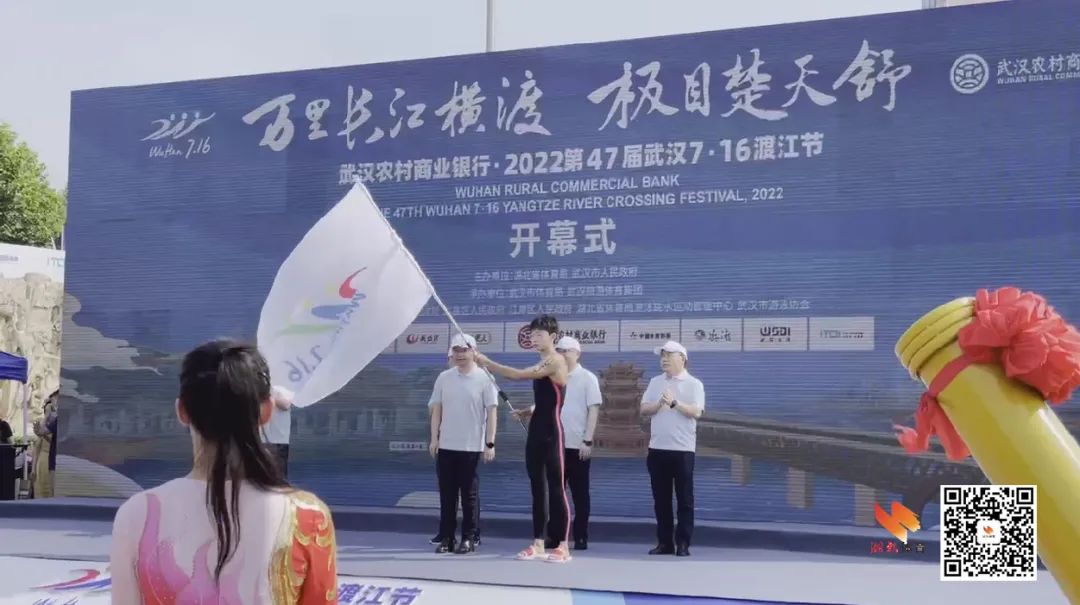 7月16日上午,武汉农村商业银行·2022第47届武汉7·16渡江节在汉阳大禹神话园盛大开幕,来自本土的92名“泳”士追寻着伟人的足迹,在长江中搏浪前行。