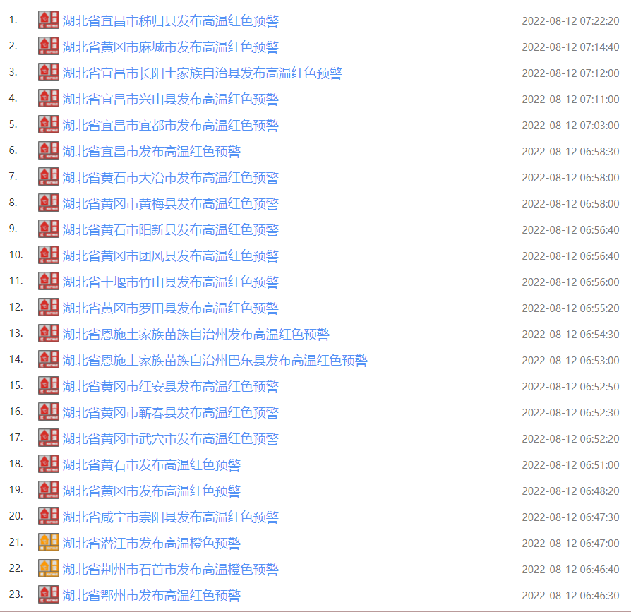 武汉中心气象台2022年08月12日06时40分发布高温红色预警信号:预计今天白天,恩施低海拔地区、十堰、襄阳、宜昌、武汉、黄冈、黄石、鄂州、咸宁最高气温将升至39~42℃,请注意防范!