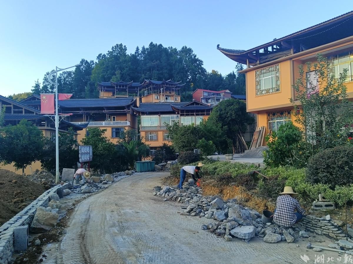 湖北日报客户端8月13日讯(通讯员秦瑗、冉家宾、伍时宜)8月12日,即使烈日当头,大坪寨院施工现场里,工人们依旧埋头苦干,将手中的砖头、石块不断转换为寨院美化的基石。
