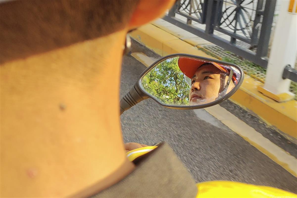 从电动车后视镜看到,接到订单后,朱海涛的脸上便鲜有笑容,话也变少了,时不时便会低头瞟一眼手机上的送餐信息。