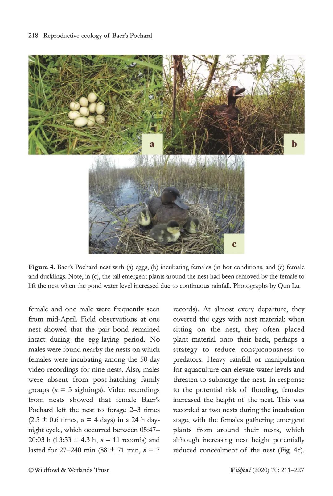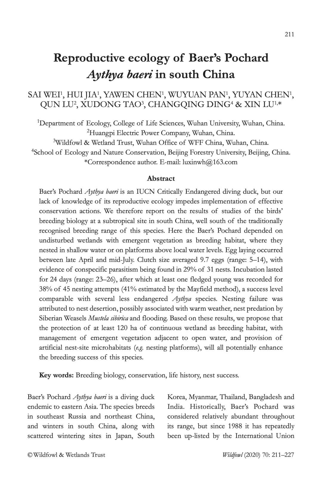 卢欣教授团队在wildfolw期刊发表的青头潜鸭论文2020年,CCF在16个省市的168个地块,支持发动315人次调查员,开展青头潜鸭越冬期全国同步调查,调查结果为1500余只。2022年1月8日-23日奔赴19个省份的205个子地块,调查数据大幅度增加,说明青头潜鸭保护已初见成效。更加令人振奋的是,人工种群方面也取得了重大成果。2019年,CCF联合北京林业大学、北京动物园和武汉大学生命科学学院开展青头潜鸭的易地保护研究。经过三年的努力,已在北京动物园建立了54只“三代”青头潜鸭人工种群。