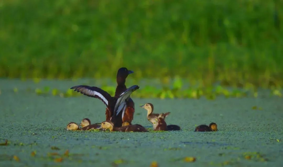 当前,以青头潜鸭为旗舰物种的湿地保护工作成为了武汉链接世界的新“桥梁”。由国家林草局牵头组织的COP14湿地缔约方大会筹备委员会代表团考察CCF东湖磨山自然教育基地时给予充分肯定和鼓励,并提出将基地作为COP14青头潜鸭保护边会的分会场,有机会向全世界分享该保护模式。候鸟展翅,人与湿地和谐共生,保护青头潜鸭的背后其实是守护长江湿地生态系统,最终回馈到地球和人类自身。最近,在东湖高新区豹澥湖新发现的一处青头潜鸭繁殖地中,自今年6月份以来已经有51只鸭宝宝诞生,受到不少人的关注。只有继续发动整个社会共同爱鸟护鸟,“山水江城任鸟飞,共享美丽大自然”的景象才能够更加怡人,才会有越来越多的青头愿意“潜伏”于城市之中,与你我休戚与共。