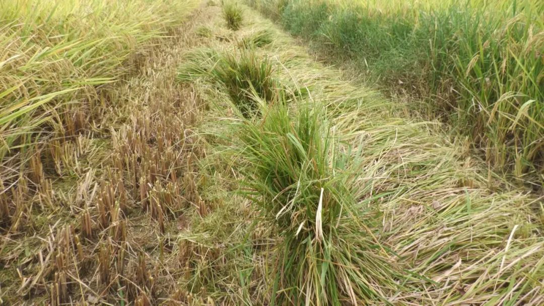 在巡店镇晒书台村的稻田里,两台驰骋的低茬收割机格外引人注目。一片片稻谷收割后,粉碎的秸秆从机尾吐出,整齐地喷撒在田间;同时收割机的旋耕刀片不断翻滚泥土,将粉碎后的秸秆直接混埋在耕作层的土壤中。
