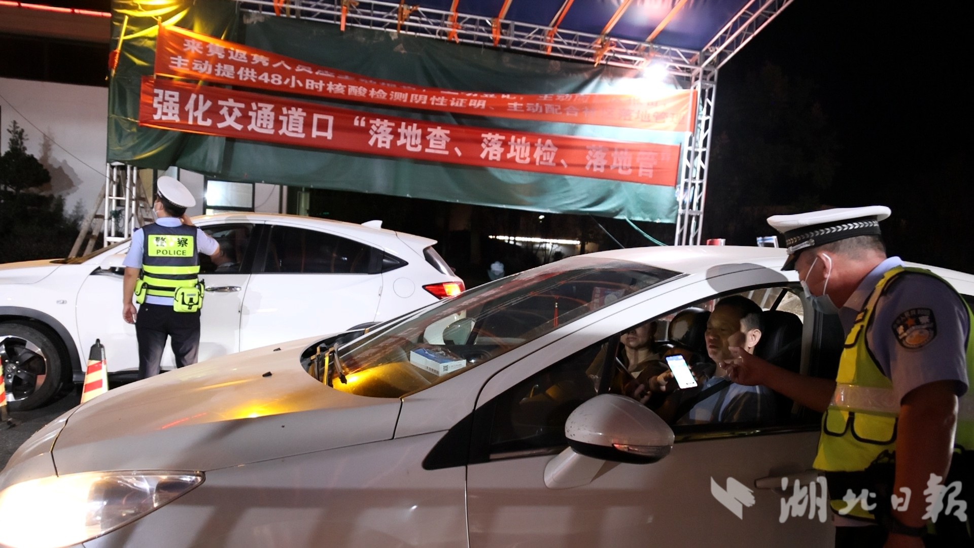 10月1日晚,在通城高速城北收费站,执勤民警正对所有来隽车辆开展两码查验等检查,同时引导重点地区人员进行登记报备:你好,请出示你的健康码、行程码,外省车辆请下车做核酸检测……看到家乡的民警在忙碌有序的指挥着下高速的车辆,车主们也纷纷主动摇下车窗,将提前准备好的健康码、行程码、核酸证明拿给民警查验。