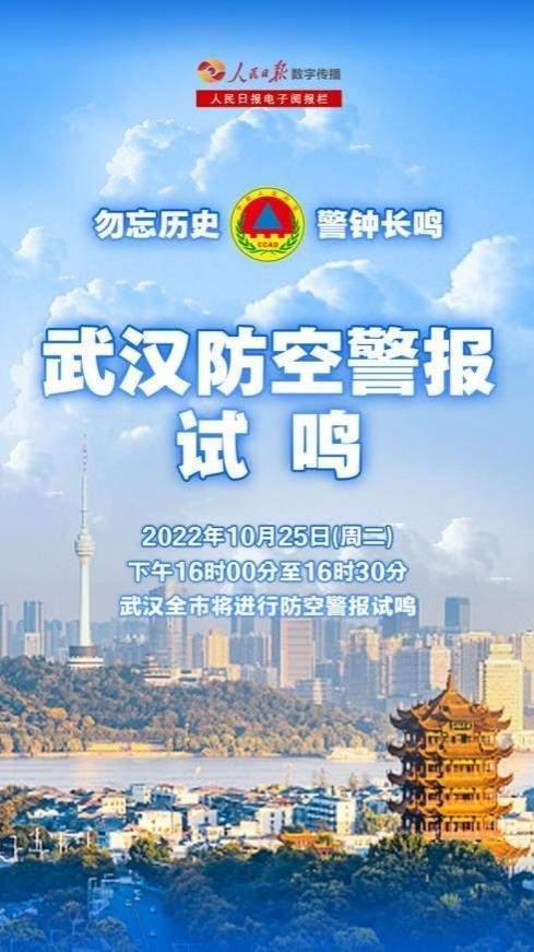 根据《中华人民共和国人民防空法》《武汉市人民防空条例》规定,经研究,定于2022年10月25日16时00分至16时30分在全市进行防空警报试鸣。期间,请各级党政机关、企事业单位、社会团体和广大人民群众保持正常工作和生活秩序。防空警报鸣放具体时间及信号规定如下: