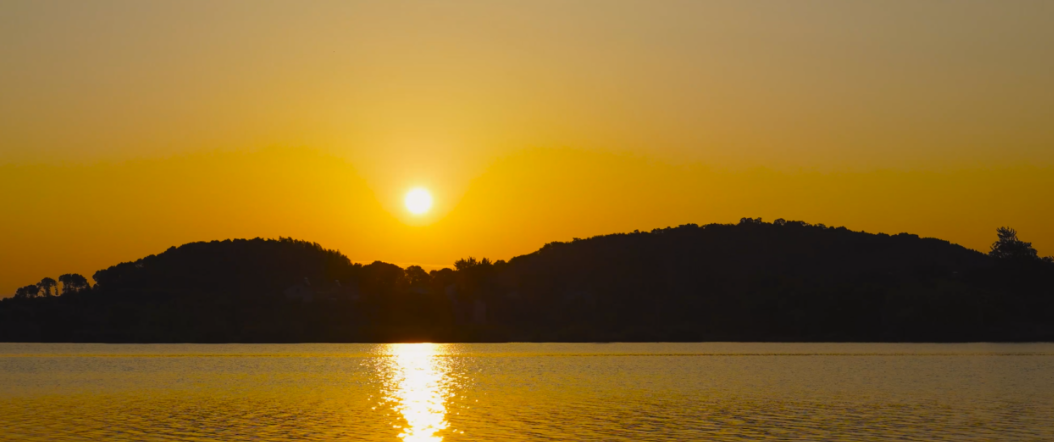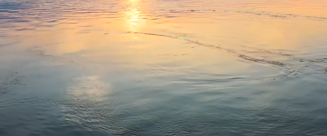 当清晨的太阳缓缓升起,山脉笼罩上了一层金色的外衣,水与天相接,水中倒映出的,是半明半暗的云。