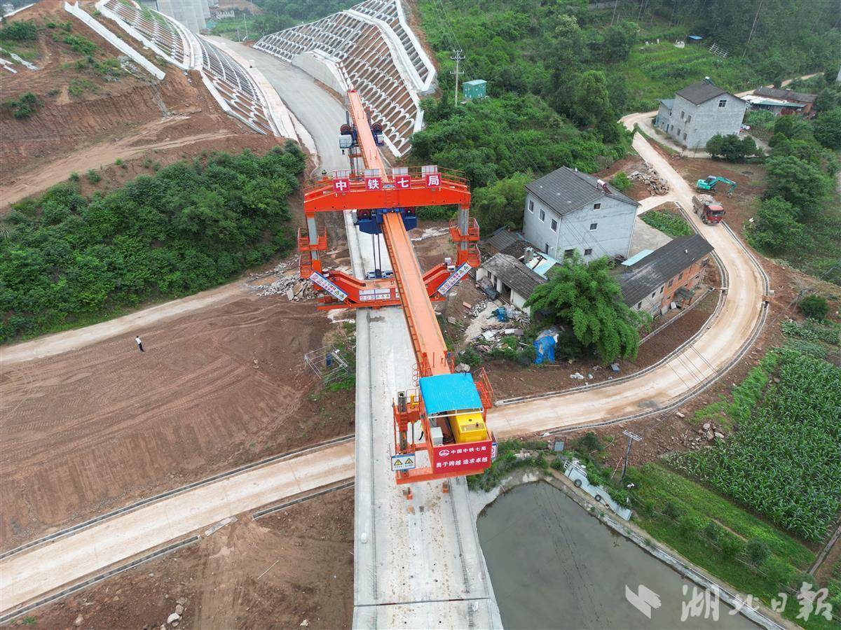 湖北日报讯(通讯员王建勋、李思靓)5月28日,随着一榀32米预制箱梁缓慢落下,标志着由中铁七局承建的沪渝蓉高铁武汉至宜昌段首座400米小半径曲线桥梁架设完成。