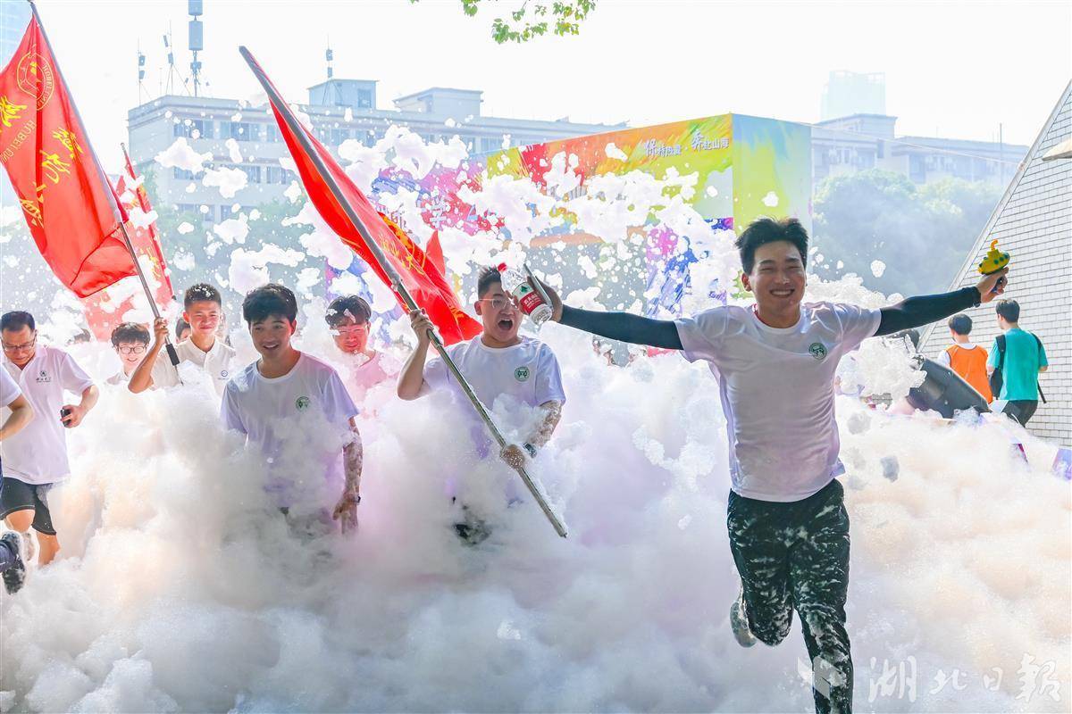 穿越喷射的泡沫和空中洒下的彩色面粉,在签名板上摁各种颜色的手掌印……6月9日,湖北大学2023年“保持热爱·奔赴山海”毕业彩虹跑火热进行。校领导带队开跑,毕业生们在校园里激情奔跑。
