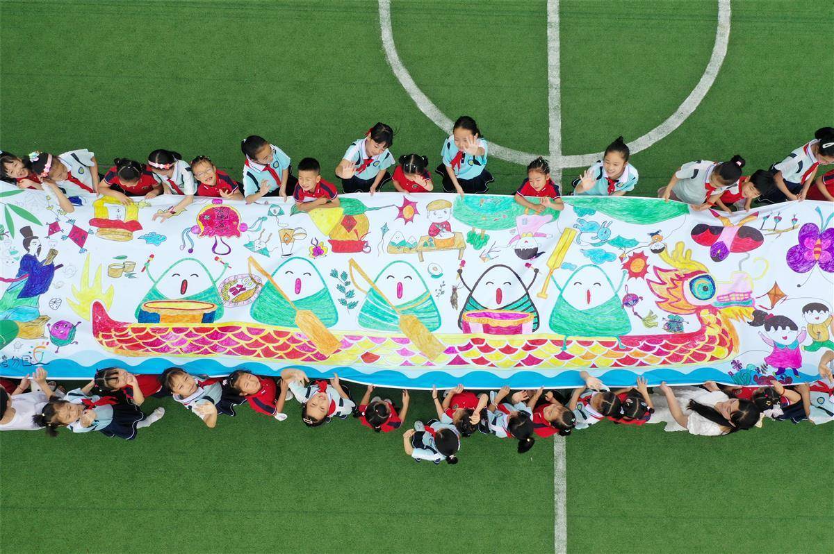 6月15日,宜昌市夷陵区开展端午文化进校园活动,小溪塔街道冯家湾小学和冯家湾幼儿园的师生们一起在“大手牵小手 浓情绘端午”绘画长卷上描绘端午文化作品,让孩子们以绘画的方式表达端午文化内涵,在艺术色彩中感悟传统文化魅力,传承中华民族悠久的情感历史,激发深厚的爱国主义情怀。(视界网 张国荣 摄)