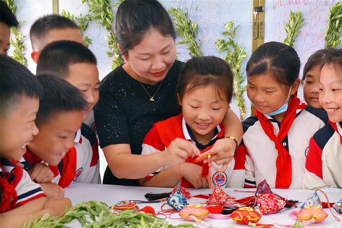 6月14日,十堰市郧阳区柳陂镇中心小学学生在老师的指导下制作香包,让孩子们从小了解端午节习俗,体验传统民俗文化。(视界网 杨显有 摄)