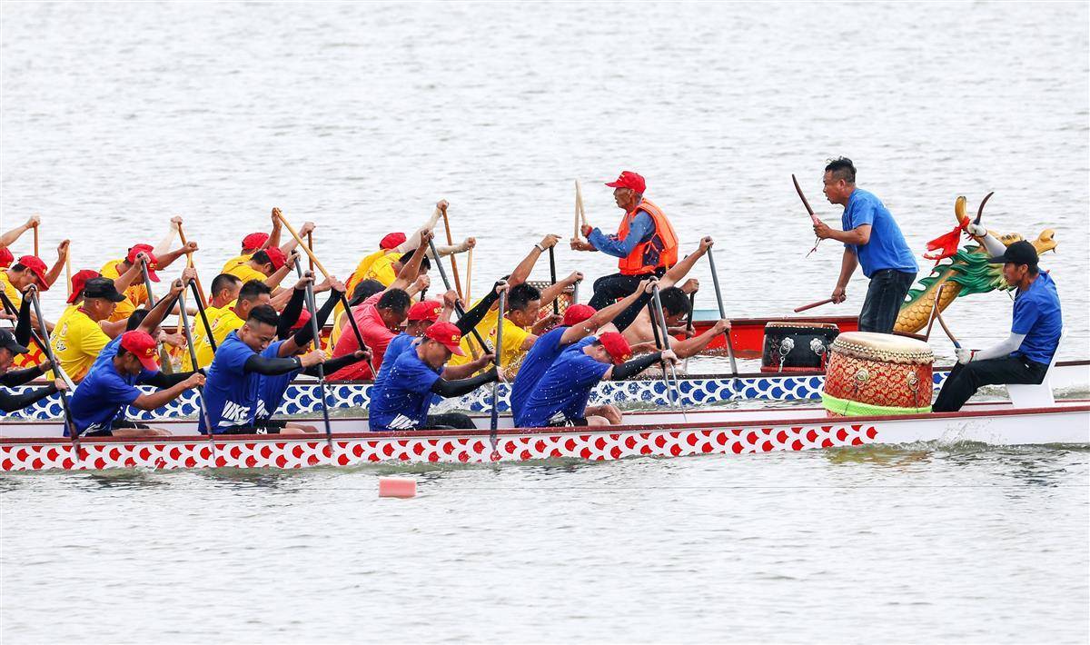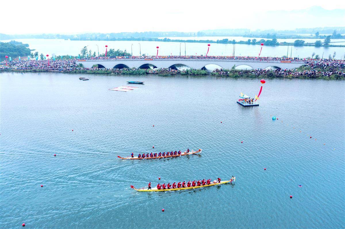 6月18日上午,“浓情端午 舞动龙舟”龙舟比赛活动在千年古城蕲春县蕲州镇雨湖隆重举办,13支参赛队伍铆足干劲,奋勇争先。(视界网 朱国祥 摄)