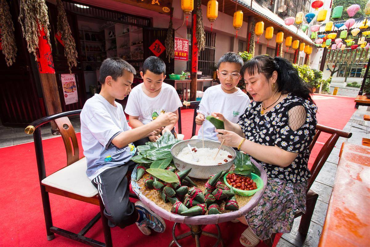 6月11日,秭归县屈原故里非遗小巷里,小孩跟着非遗传承人学习制作“秭归粽”。秭归的粽子是尖角形的,包粽子时糯米中间要放颗红枣。棱角分明的外形,象征着屈原刚直不阿的性格;雪白的糯米,象征着屈原出污泥而不染的品质;红枣,象征着屈原对国家的赤诚之心。(视界网 郑坤 摄)