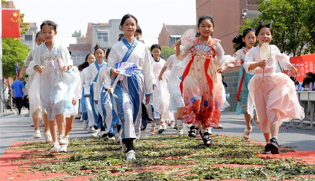6月19日,在老河口市孟楼镇孟楼小学里,身穿汉服的同学们排队走过铺满艾草的长廊,在老师的带领下点朱砂、沐艾汤、诵经典、挂吉祥……用有趣的民俗活动纪念传统节日。(视界网 杨东 李雯艳 摄)
