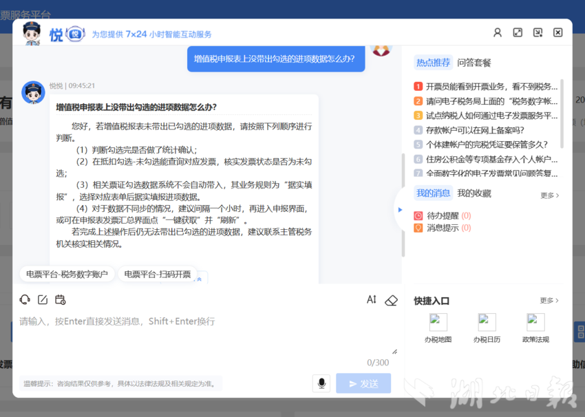 24小时AI“云问答”。“您好,若增值税报表未带出已勾选的进项数据,请按照下列顺序进行判断……”这是人工智能“悦悦”在深夜为十堰圣伟屹智能制造有限公司办税人员进行相关答疑。