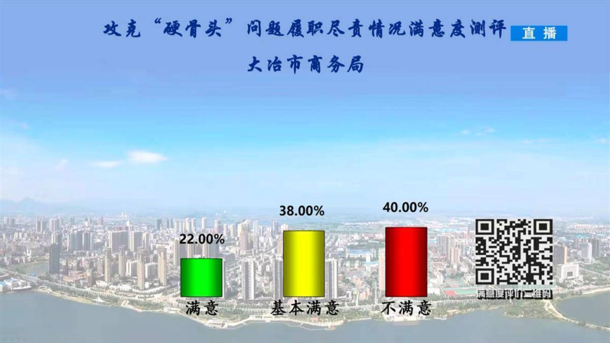 现场评议团对大冶市商务局攻克“硬骨头”问题进行投票,投票结果为:满意22%,基本满意38%,不满意40%。