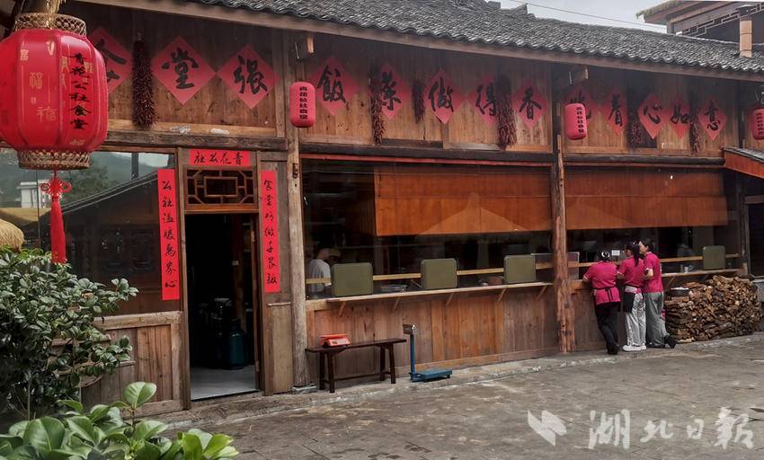 随着游客越来越多,村支“两委”和驻村工作队多方协调、争取乡村振兴衔接资金200多万元,将青花银兴影院后面一处废旧幼儿园改造为青花公社食堂,引入市场主体运营,让观众、游客看完电影就能吃上热腾腾的土家美食。