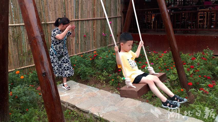 食堂以土家木屋造型为基础,布置了灯笼、水车、池塘、秋千等,摆放了蓑衣、斗笠、酒坛等老物件,环境舒适,让人感到放松。