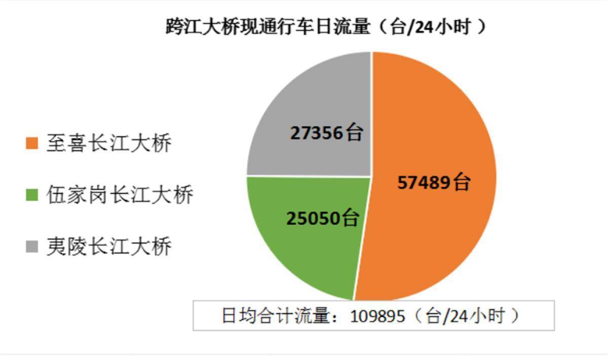 经统计,目前城区跨江大桥流量为109895台/日,其中至喜长江大桥占比52%、夷陵长江大桥占比25%、伍家岗长江大桥占比23%,至喜长江大桥为城区跨江通行的首选通道。