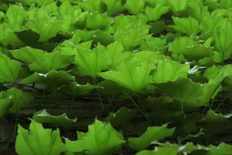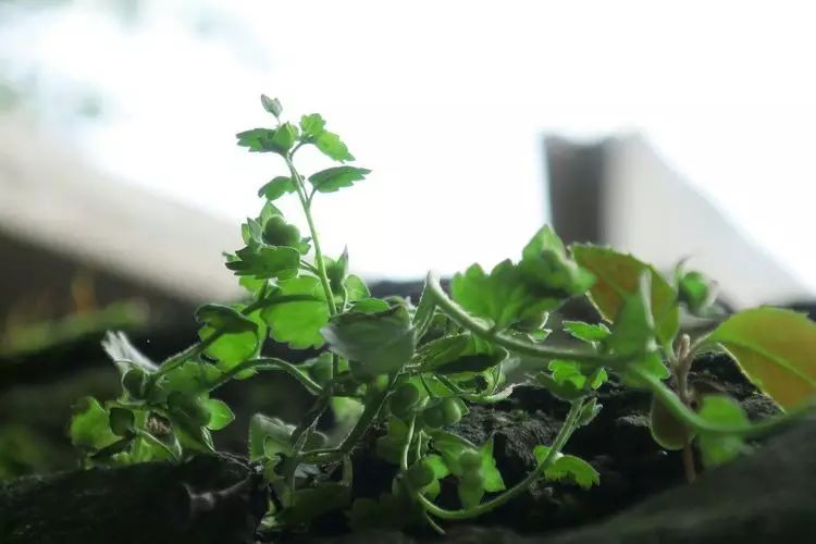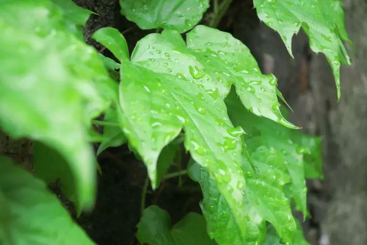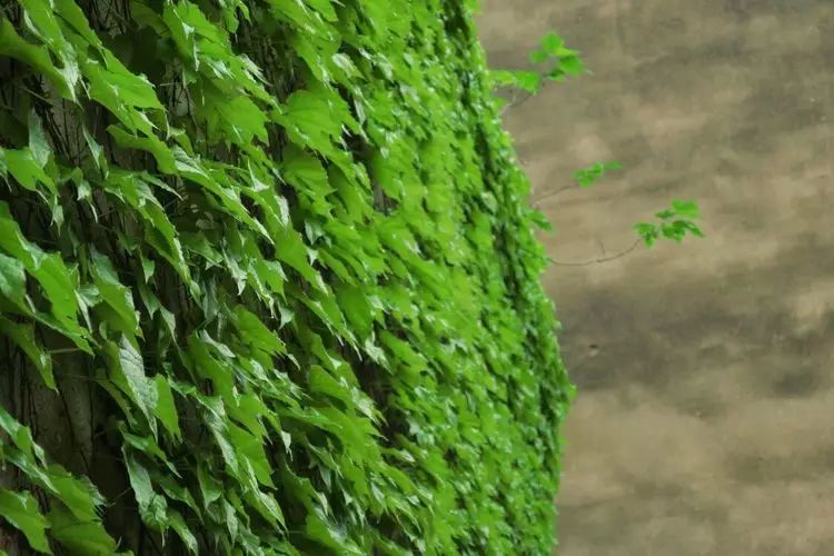 爬山虎总是顺着茎巴在墙面上向四周顽强地生长着,