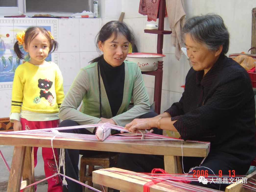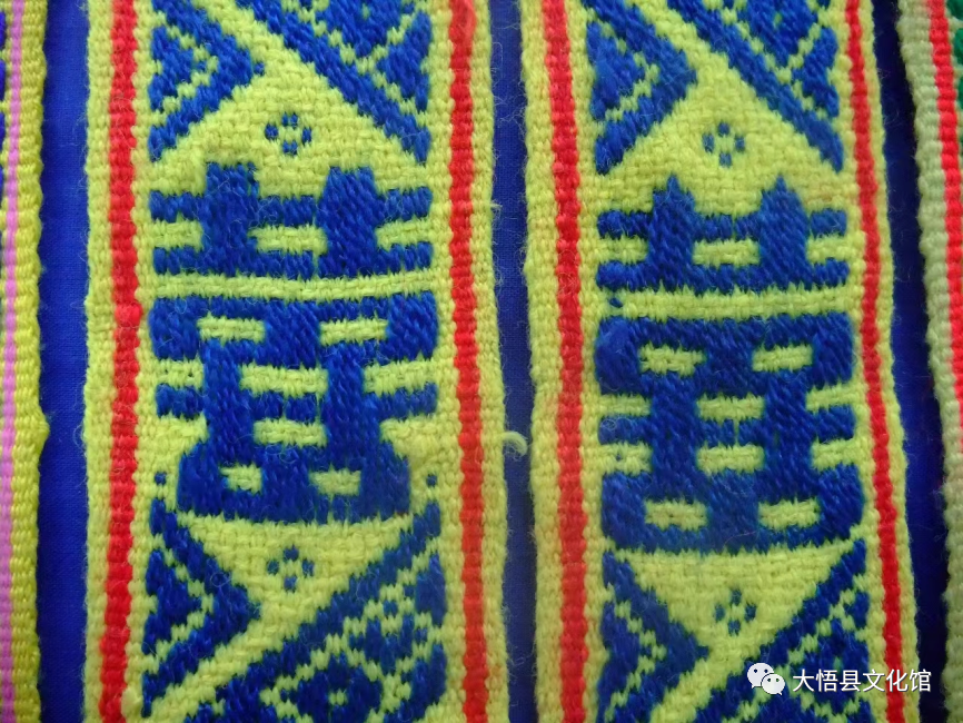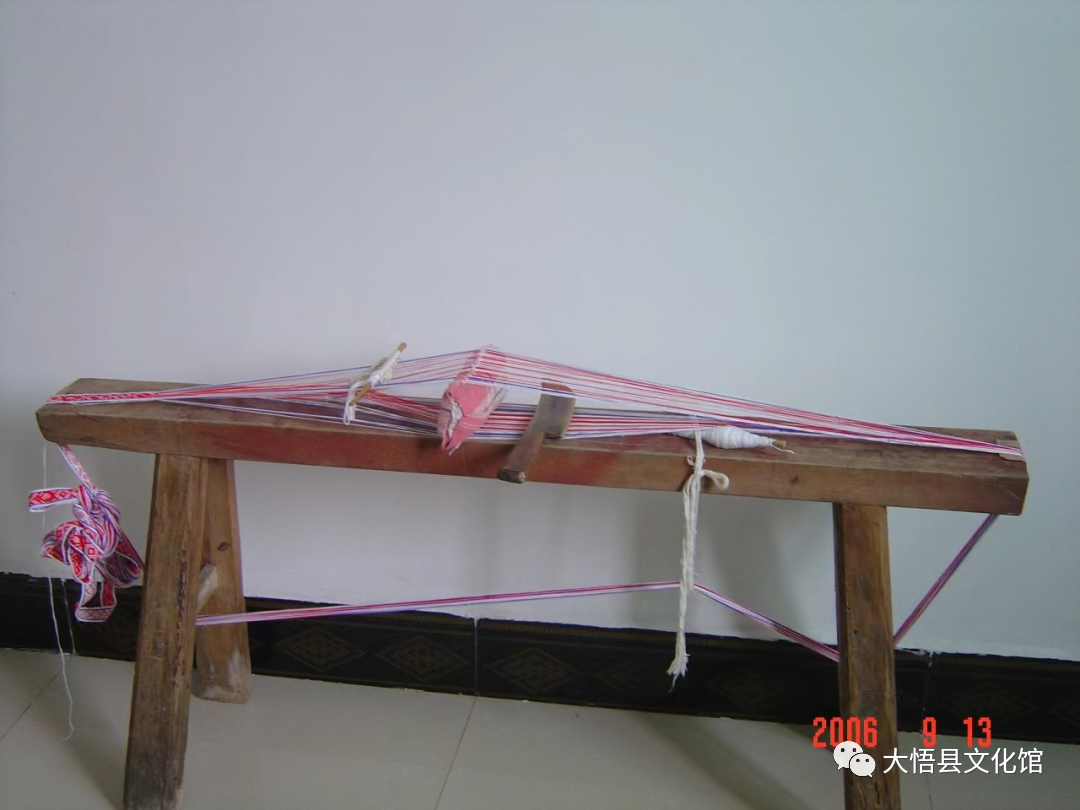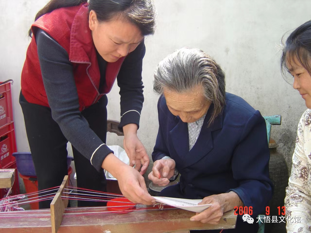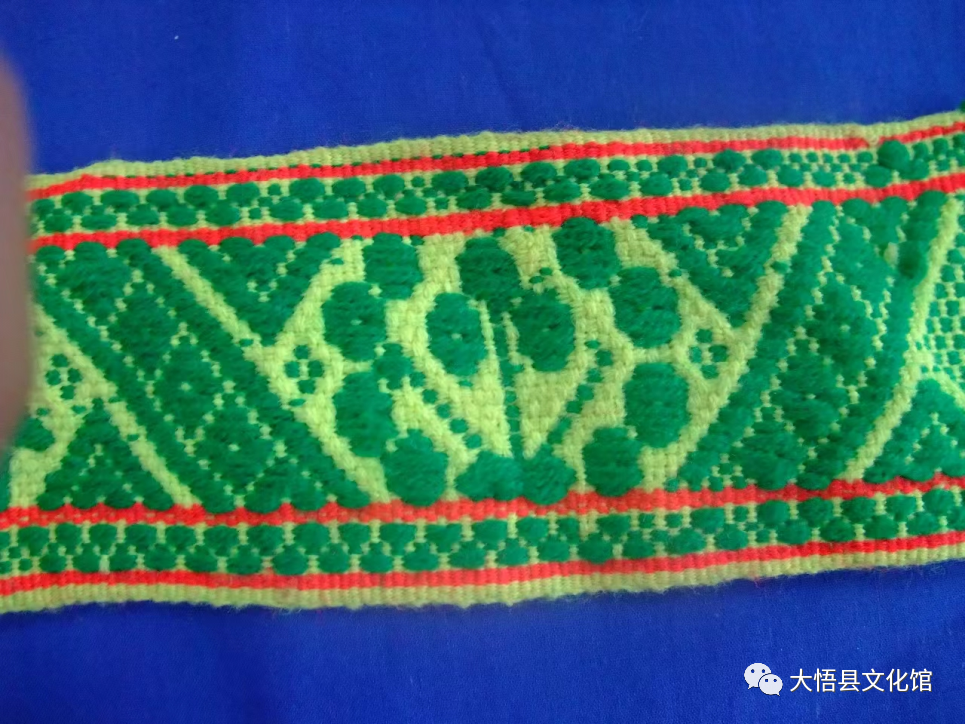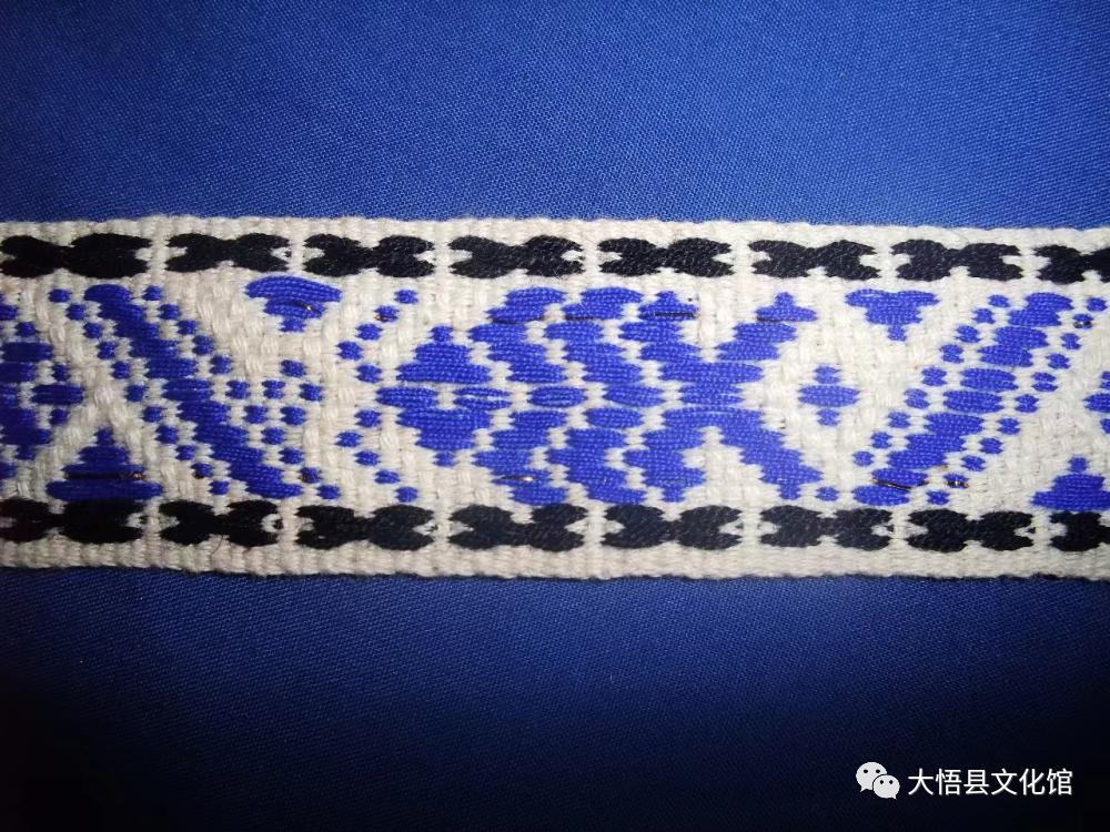 大悟织锦带是大悟的一种民间工艺品,其编织方法属传统手工技艺。自古以来,一直流传于大悟县中南部的城关、阳平、新城、四姑、河口、吕王、宣化等乡镇。该工艺品产生于清朝道光、咸丰年间,那时,在大悟的东南部出现了布庄。这里的农民就开始大量种植棉花,再织成布卖给布庄。织布用的经线,必须缠绕在织布机的卷轴上。布织好后,布疋两端会有一些没法织完的经线。农妇们舍不得扔掉这些线头,就用这些线头来编织带子。到民国时期得到广泛应用。目前,仅有为数不多的艺人还能编织。它是以单调的蓝、红、白、黄等颜色的棉线或彩色丝线手工织成的,具有各式各样花纹或图案的带子,宽2至4厘米。大量用于帽带、围裙带、抱裙带、裤腰带、绑腿带、吉他带等,亦可做男人的领带和妇女衣服的滚边。不同的花纹寄寓不同的含义:白果图案的织锦带用于捆绑嫁妆,寓白头偕老;蝴蝶闹金瓜图案,寓意团团圆圆;莲、笙、桂、梓图案寓连生贵子。编织锦带,用靠背椅、长板凳、木梯等做机床,而且对机床没有特殊的尺寸要求。用筷子、刀状木片编结提花。由于使用的工具简单,没有文化的妇女也可以学习。其主要技巧不在于使用工具,而在于手工编出精美的花纹。