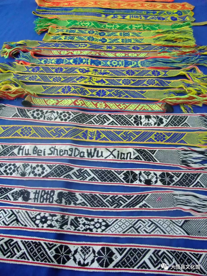 由于它具有较强的实用性,而且具有审美价值、艺术价值、历史研究价值,可以作为旅游产品加以开发。1987年,大悟织锦带作为湖北省重点民间美术之一,列入《湖北民间美术展览》,在武汉展出。1987年,有16件织锦带作品,被选到送北京参加了第一届中国艺术节,于9月6日至10月4日在中国美术馆展出。其中9件作品,于1988年被选到送意大利、苏联、利比亚等国家展出。2005年,大悟织锦带经大悟县人民政府命名,列入了《大悟县第一批非物质文化遗产代表作名录》,2006年,申报进入了《孝感市第一批非物质文化遗产代表作名录》。通过大悟县文化馆的不懈努力,《大悟织锦带》已申报为省级非物质文化遗产代表性项目。来源:大悟县文化馆