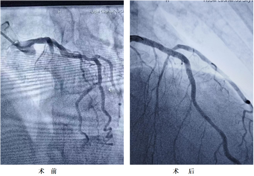 术中造影发现,该患者心脏前降支这条心脏主要供血血管近段闭塞,病情凶险!介入团队凭借精湛的医术,用时20分钟就将导丝通过堵塞的血管并植入支架。心脏血流恢复后,患者症状立刻缓解,转危为安。