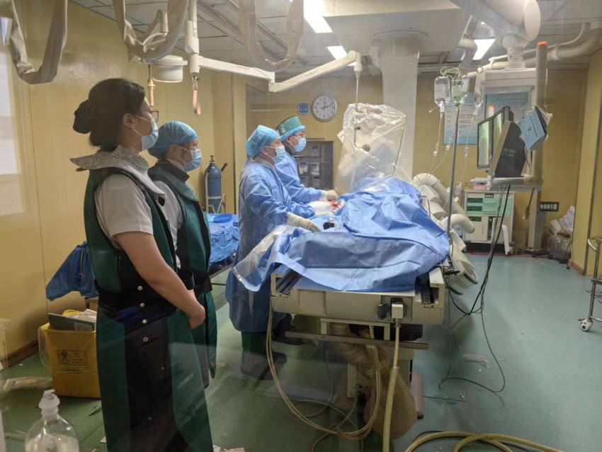 患者需要紧急手术,可他身边只有同伴陪护。郑医生通过电话与其远在山西的家属沟通病情,建议行急诊冠脉介入手术。在征得其家属同意后,胸痛中心医疗总监熊旭光立即启动胸痛急救绿色通道。随后,心内科副主任张彩平、董建立带领胸痛介入团队赶往导管室,为患者做心脏介入手术。