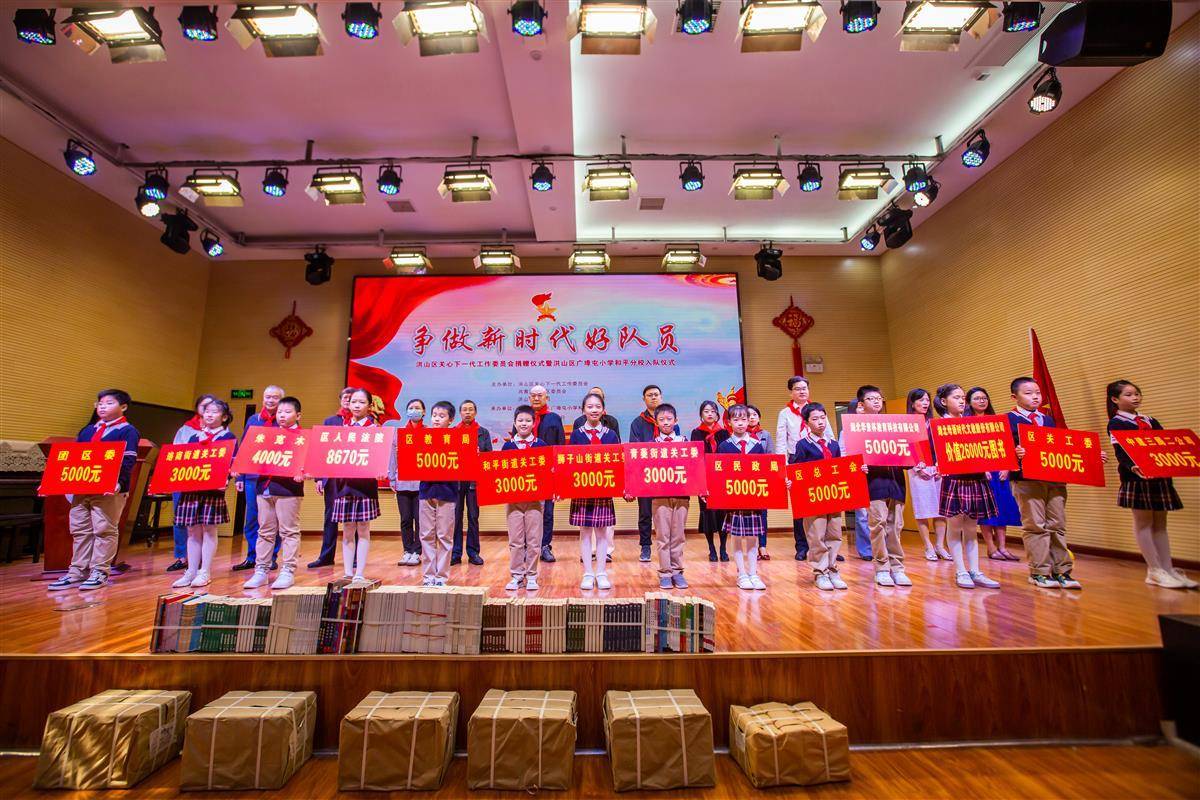 参与爱心捐赠的包括中建三局二公司、湖北华素杯教育科技有限公司、湖北母语时代文教股份有限公司、爱心人士朱克木等。这些爱心单位、爱心企业、爱心人士为少先队员们送来节日的祝福与慰问,并捐赠爱心善款和书本物资共八万余元。洪山区广埠屯小学和平分校举行少先队员入队仪式,开展班级红色节目等精彩展演,为少先队员的节日增添一抹鲜艳的色彩。