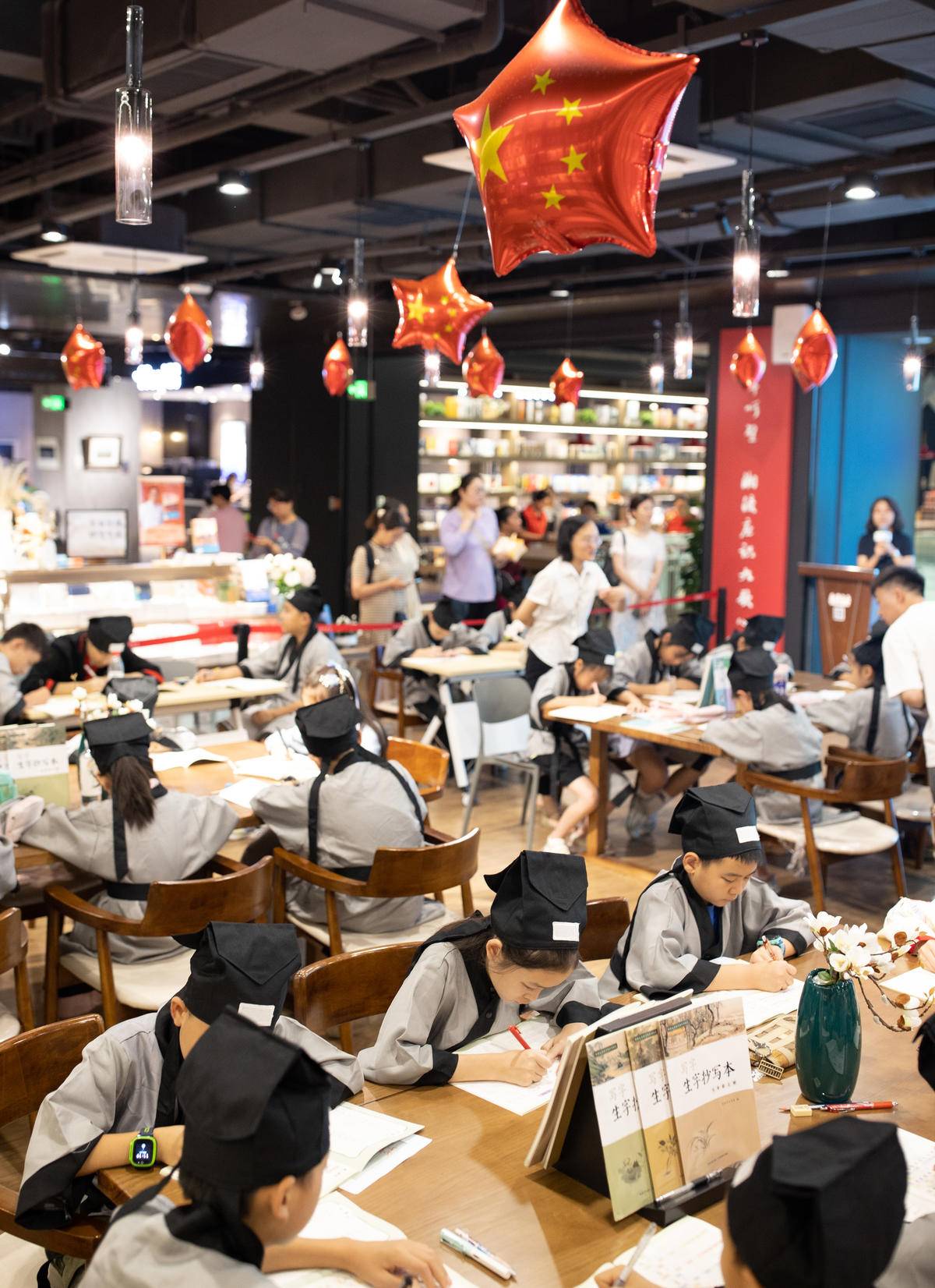 2023年8月6日,宜昌屈原书城橘颂讲堂,40多位身着汉服的中小学生在宜昌屈原书城参加“暑假写一手好字”汉字书写比赛。(湖北日报全媒记者 柯皓 通讯员 杨明声 摄)