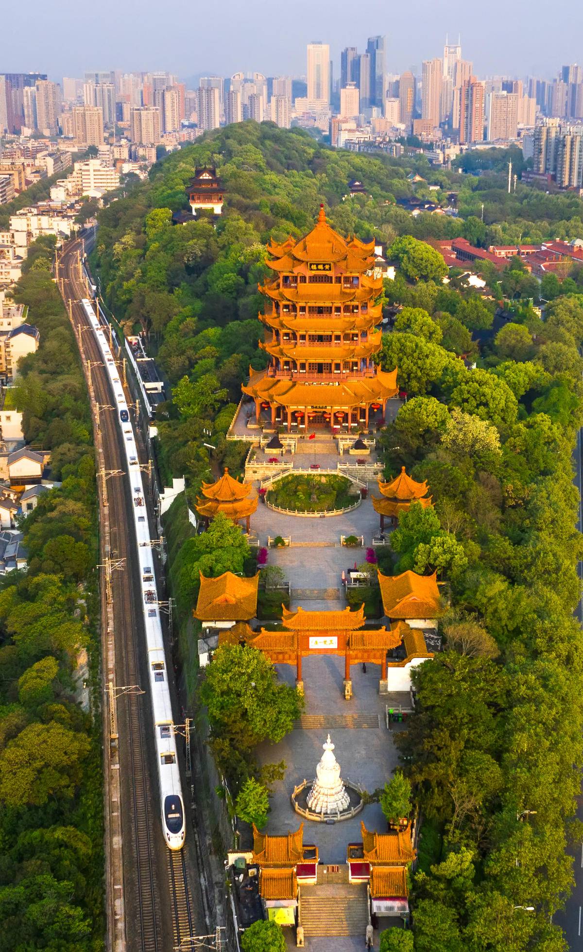 一列动车组从黄鹤楼旁边经过。(湖北日报全媒记者 陈勇 摄)