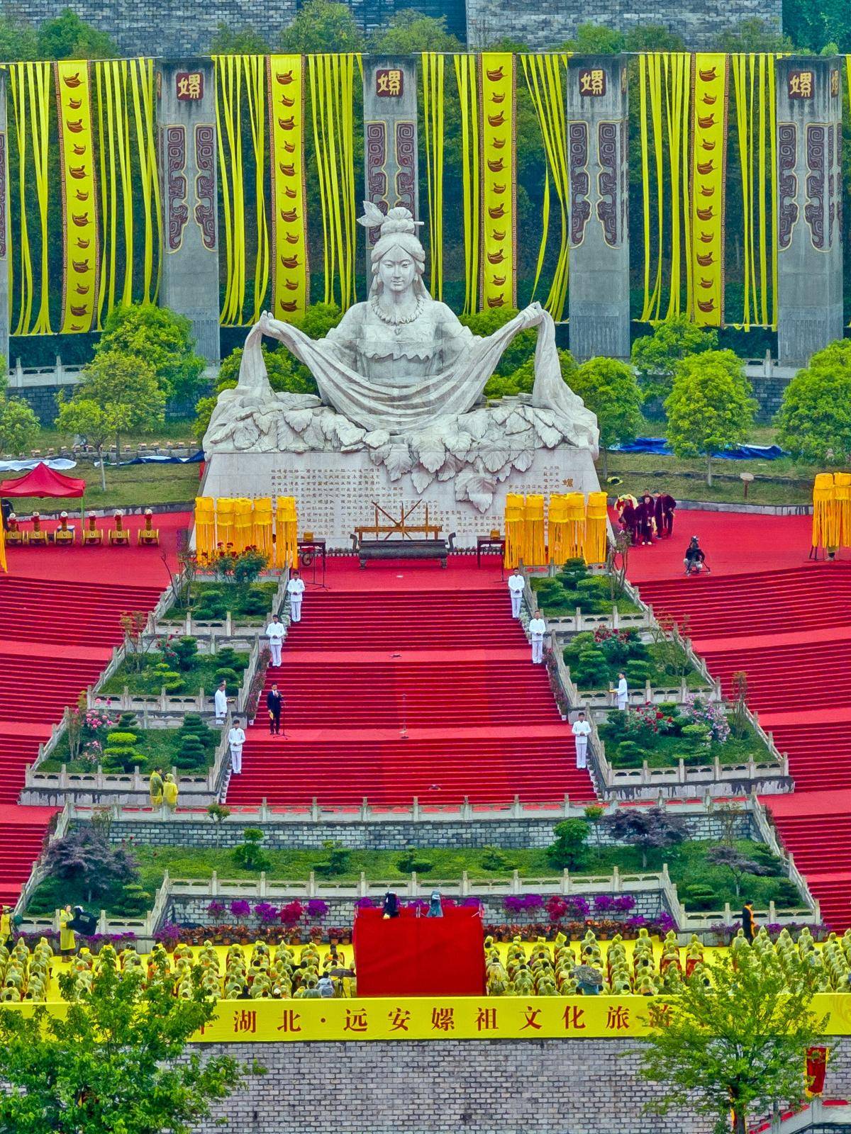 2023年5月4日,“癸卯年湖北·远安嫘祖文化旅游节”开幕,45名蚕妇顺台阶而上,依次向嫘祖像敬香揖首,演示国家级非物质文化遗产——“嫘祖信俗”的仪式流程。(湖北日报全媒记者 刘曙松 通讯员 王丹 朱丽君 摄)