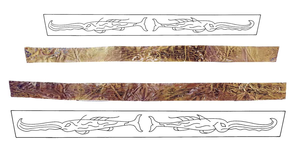 两条金带上刻画了四条怪鱼