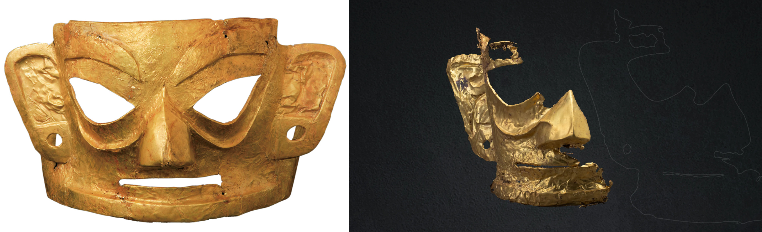 △左为金沙遗址出土的商周大面具,右为三星堆遗址出土的金面具残片。