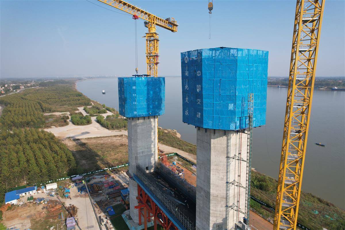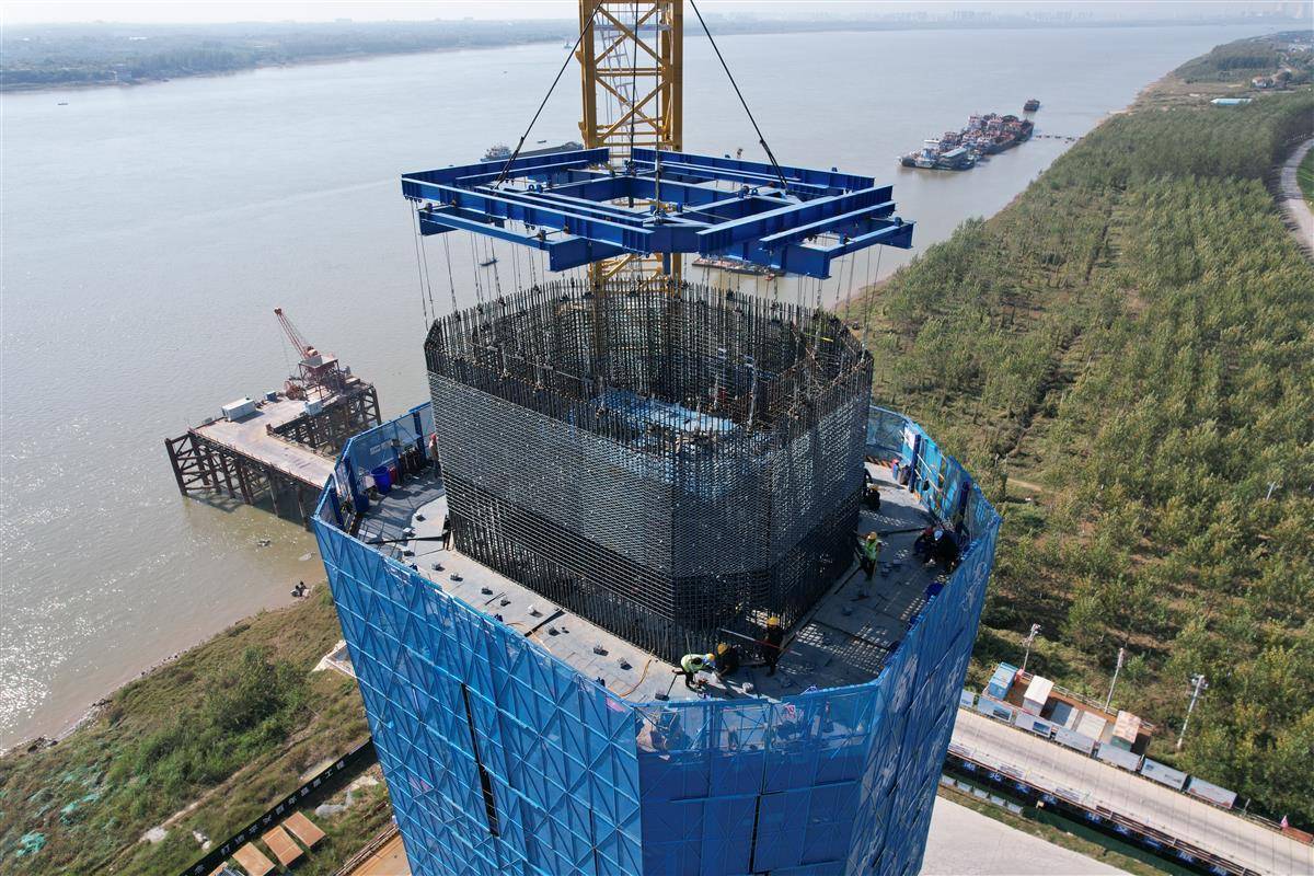 长江北岸,两座高塔比肩而立,现场轰鸣声不断。技术员轻轻按下操作键,约5层楼高的一体化智能筑塔机缓慢爬升,仅一个半小时就完成一次6米“登高”。施工平台上,一片片排布匀称、焊点密实的钢筋网片被吊入钢筋部品胎架中,工人仅需1至2天就完成一节塔柱“骨架”的拼装。