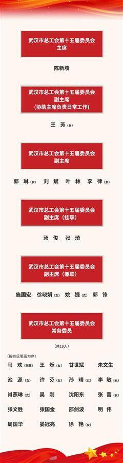 湖北日报讯(记者刘畅、通讯员贺鹏)11月17日下午,武汉市总工会第十五届委员会第一次全体会议召开,选举产生了武汉市总工会第十五届委员会主席、副主席和常务委员。陈新垓当选为武汉市总工会主席。(具体当选名单见图片)
