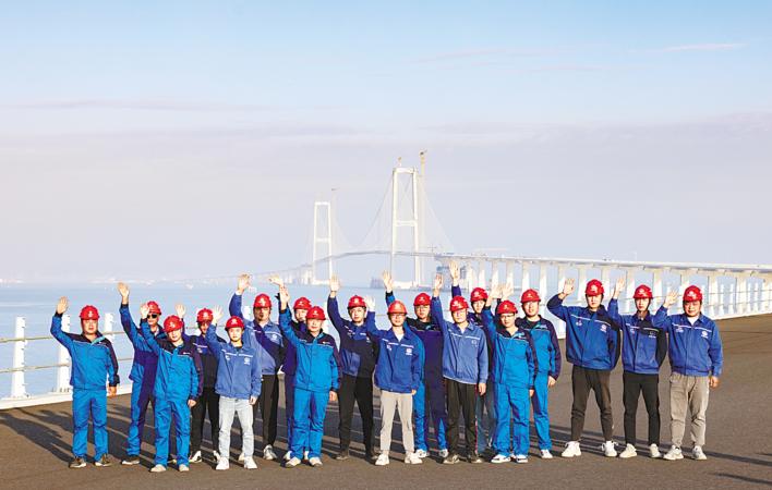 11月28日,深中通道参建在鄂央企的建设者们在伶仃洋大桥前合影留念。当天,历经近7年艰苦建设,全长24公里的深圳至中山跨海通道主线贯通。(湖北日报全媒记者 柯皓 摄)