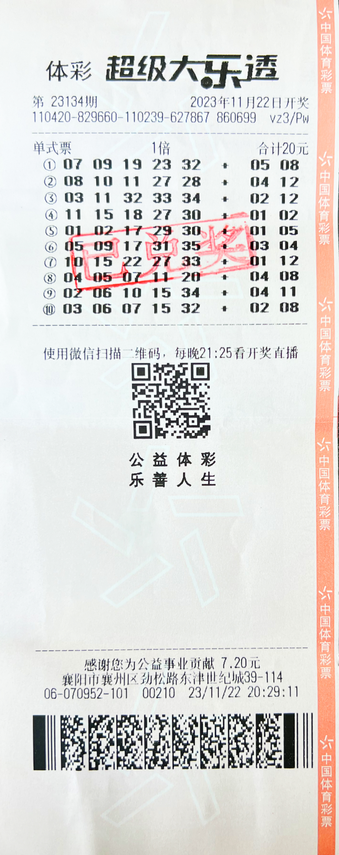 11月22日晚,临近开奖时施女士突然想起当天是大乐透开奖日,便赶紧走进熟悉的70952销售点参与投注。店老板介绍,最近买大乐透长票可参与赠票活动,长票的中奖率高、体验感更好。“听人劝,吃饱饭。”还没玩过长票的施女士,立马打了一张20元的大乐透长票。