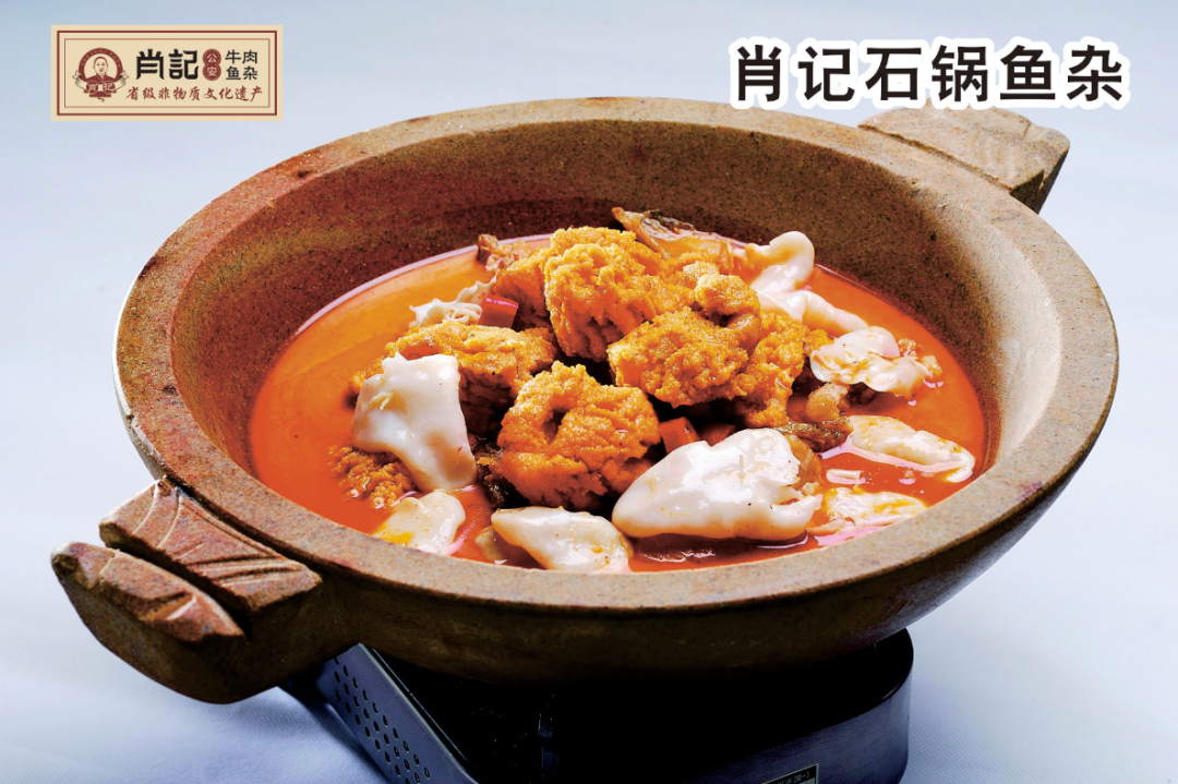 石锅鱼杂是店内的招牌特色菜之一,鱼杂是精选的优质野生花鲢鱼鱼籽,以鱼头、鱼籽、鮰鱼肚一起烧制,保证口感糯滑而有嚼劲。