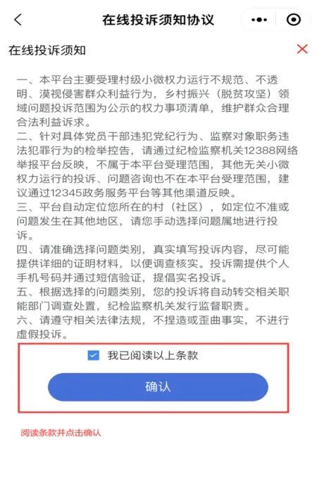 第3步:阅读在线投诉须知后勾选“已阅读”,点击“确认”