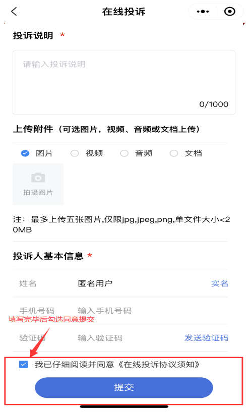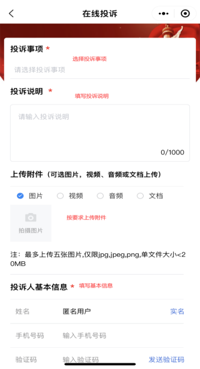 第4步:按要求填报“投诉事项”“投诉说明”“投诉人基本信息”,上传相应附件等
