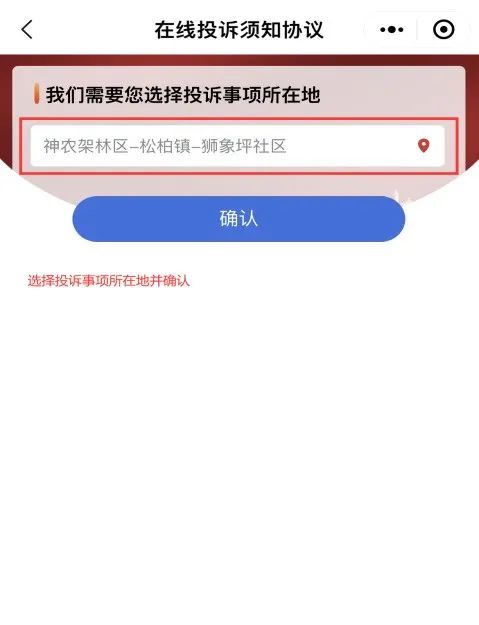 第2步:选择投诉事项所在地点击“确认”