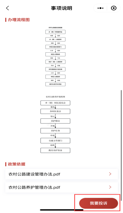 第4步:查看“事项说明”“办理流程图”“政策依据”等,点击“我要投诉”