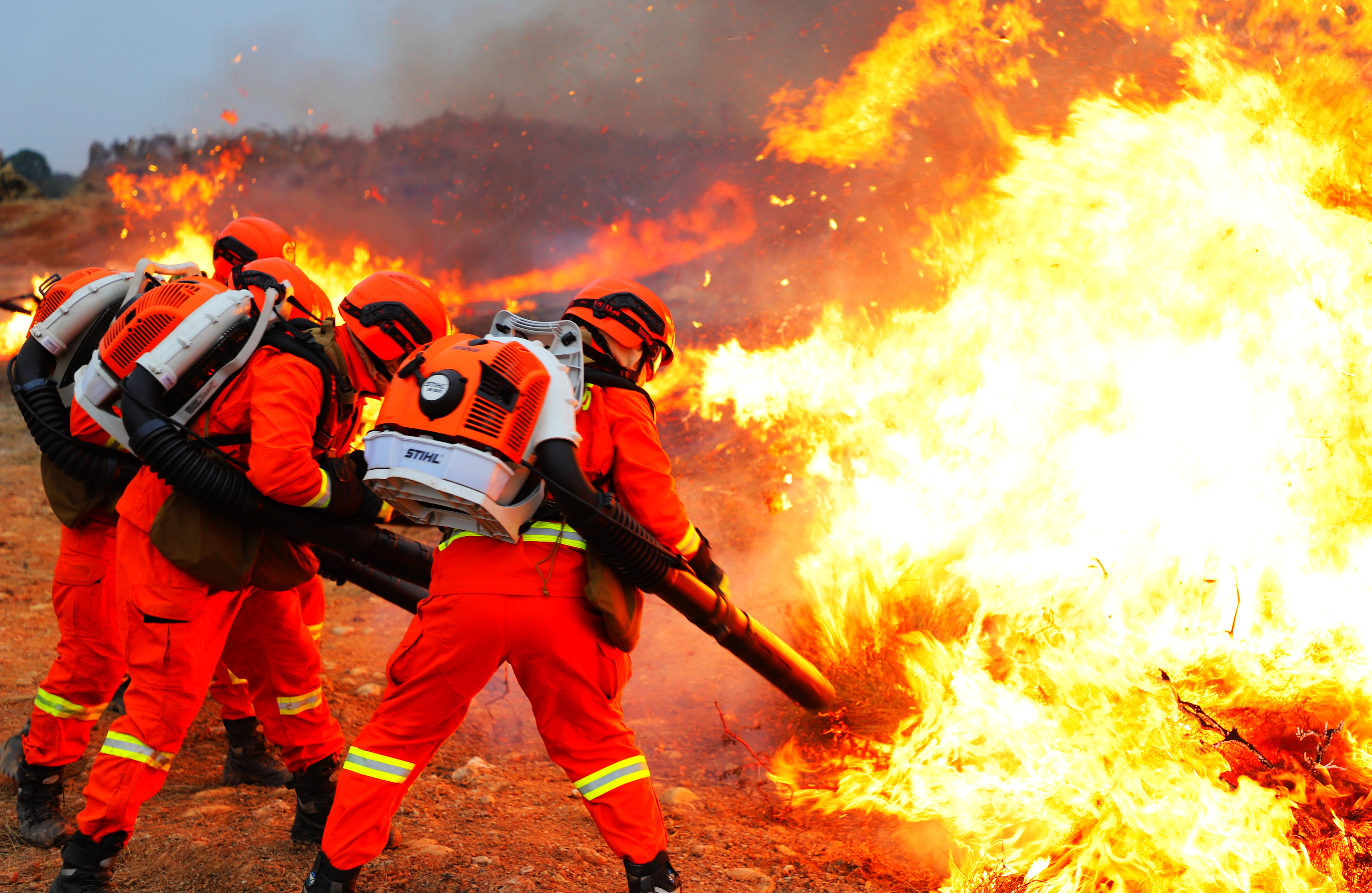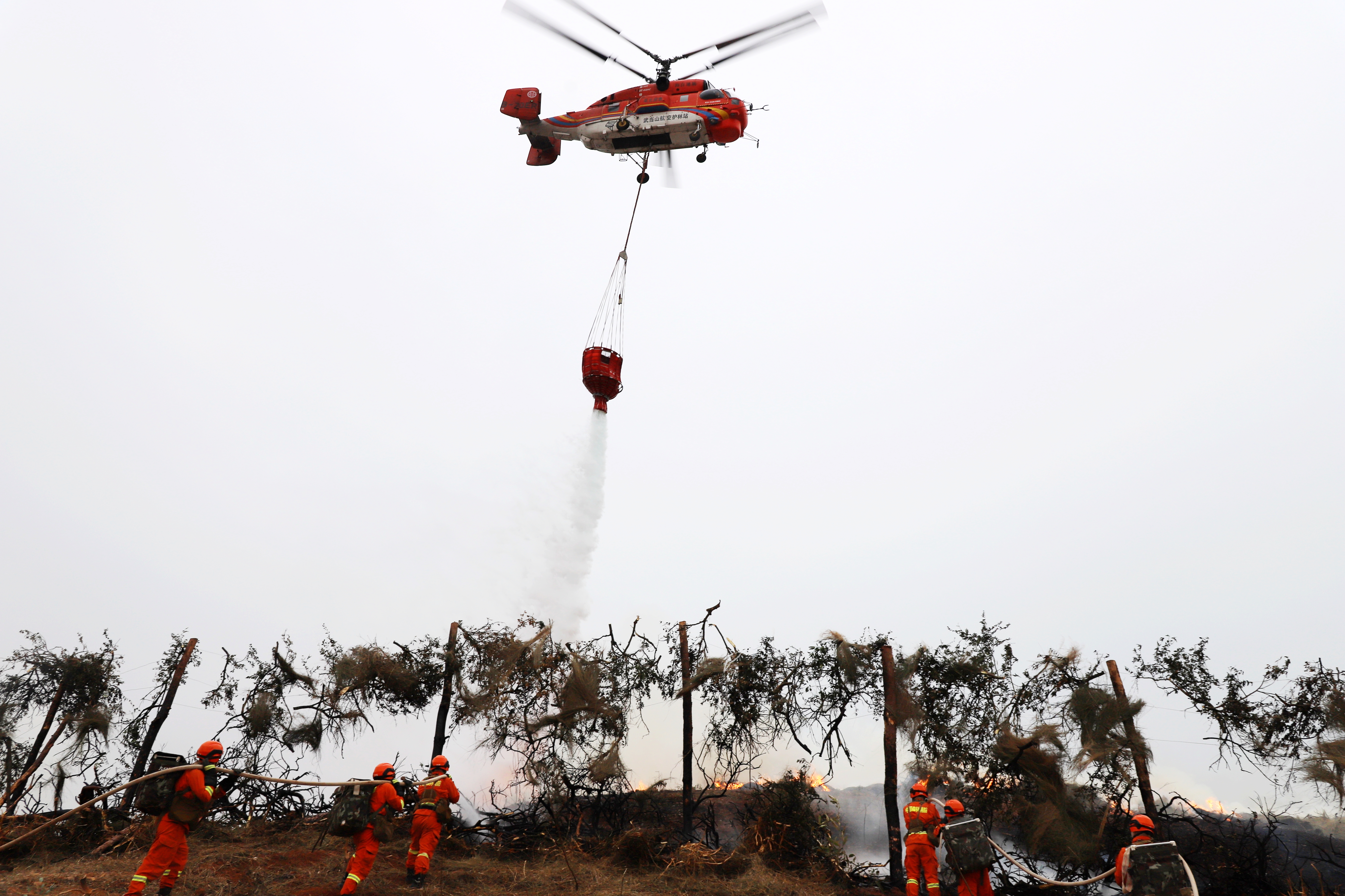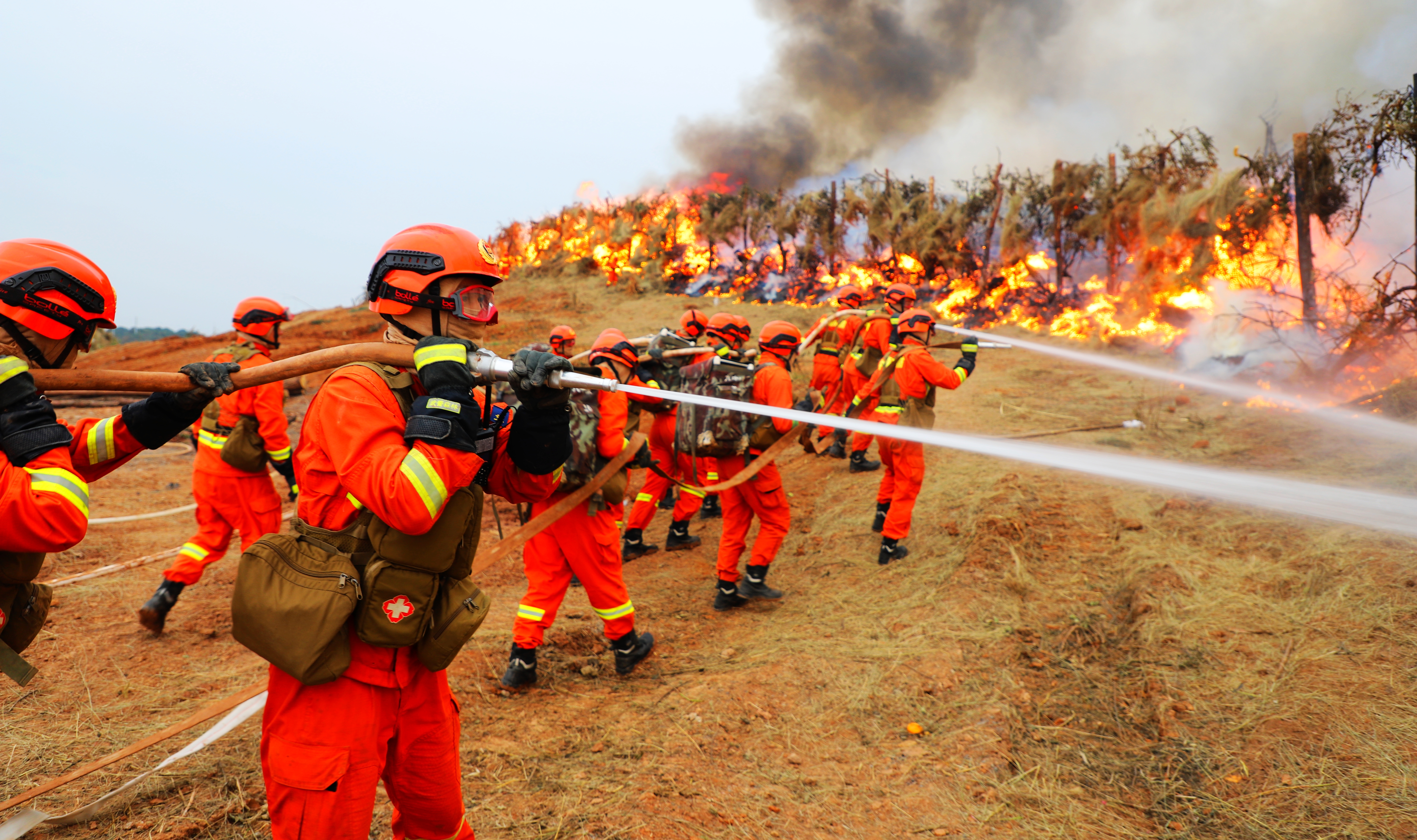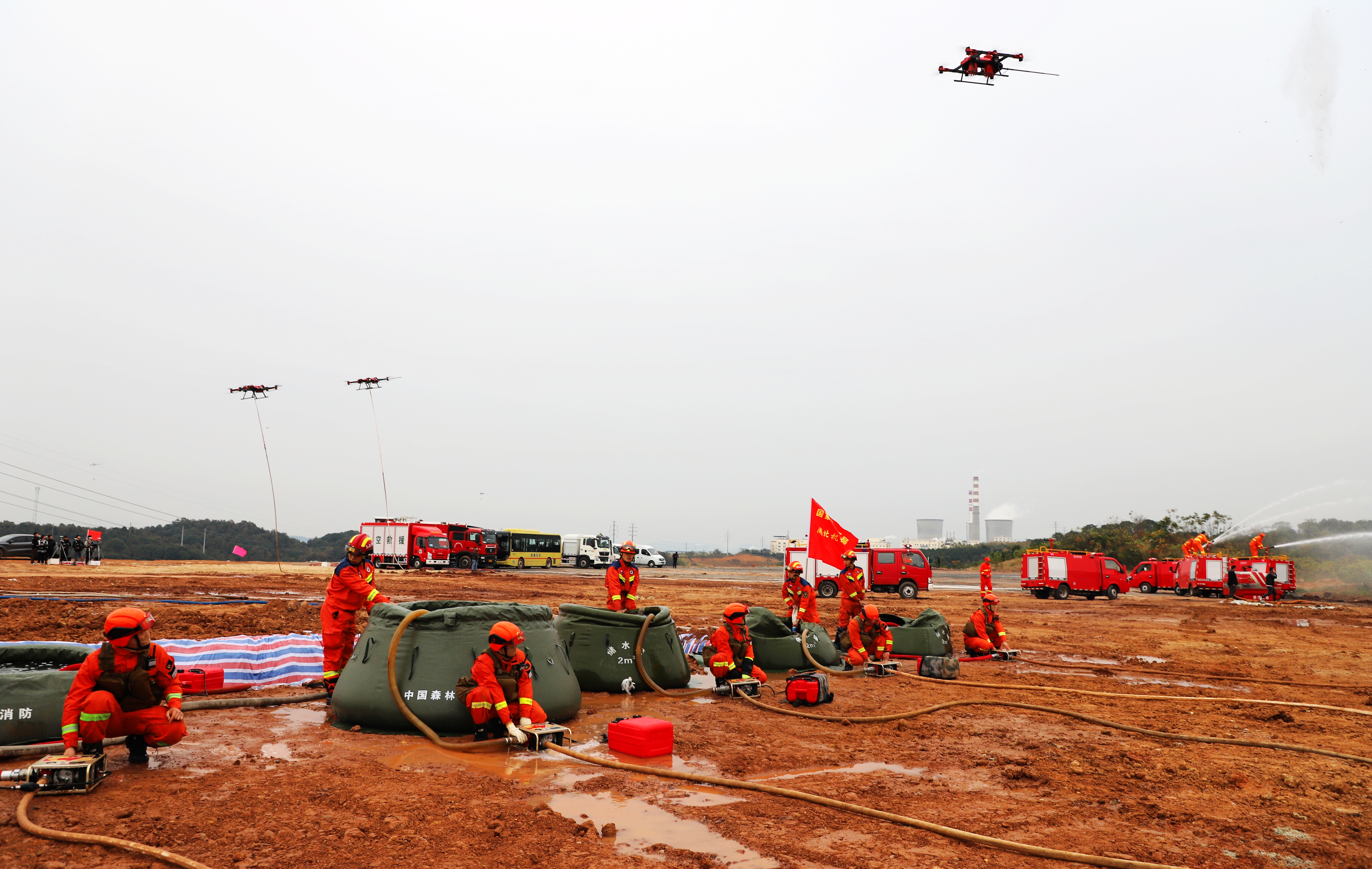 空中,灭火无人机群一字排开,抛下灭火弹。直升机外挂吊桶,向火场洒水;地面上,龙吸水森林消防远程供水(灭火)机器人、全地形车、大功率水罐消防车等齐出动,向起火点喷射……
